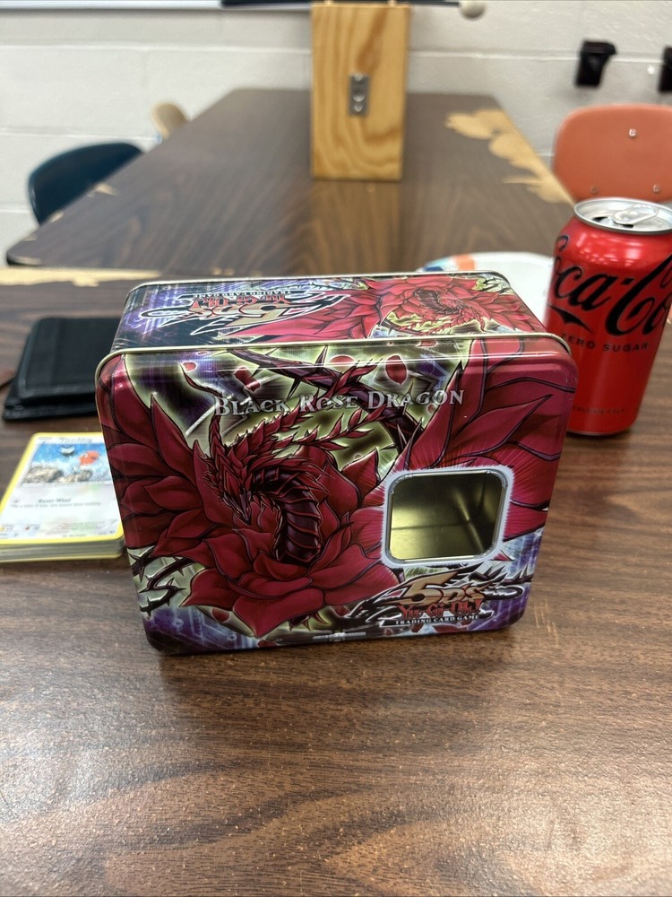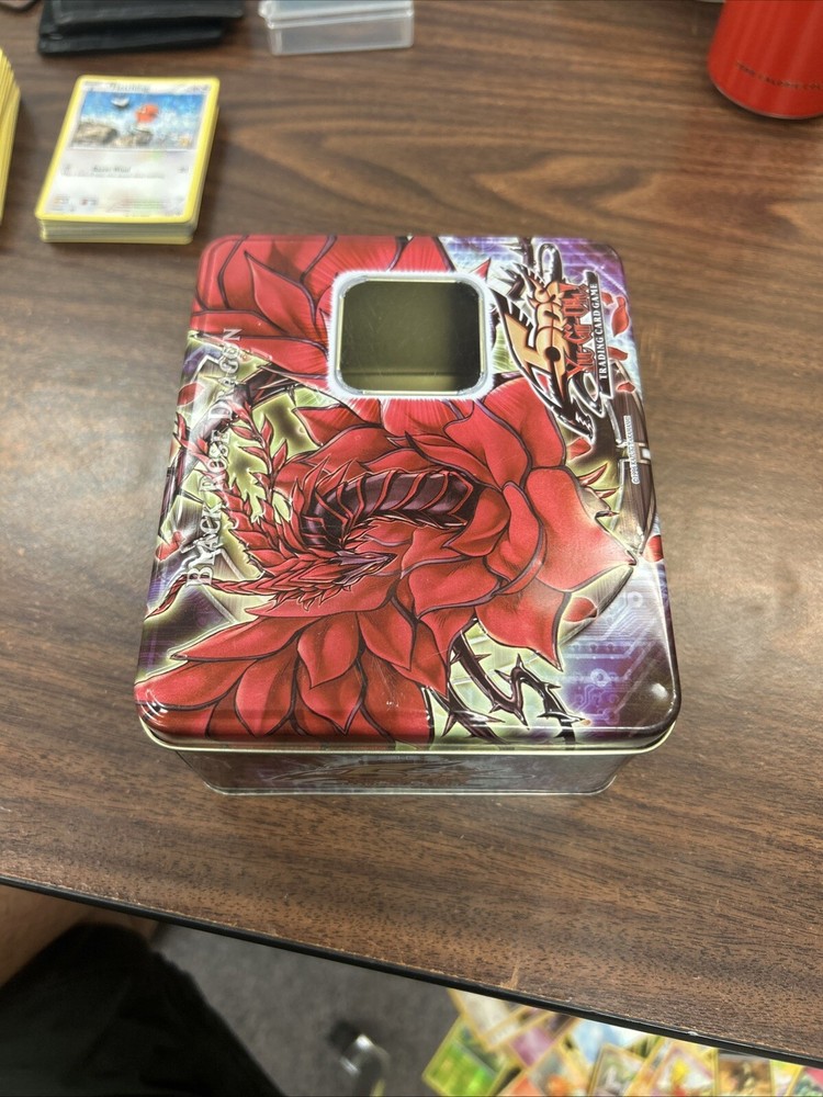 The product is a Yu-Gi-Oh! 5D's Black Rose Dragon Collector's 2008 Tin in excellent shape. This collector's tin features Turbo Warrior character from the Yu-Gi-Oh! 5D's TV show and belongs to the Yu-Gi-Oh! franchise. It is a standard-sized pack made of red paperboard, manufactured by Konami in 2008. The tin is a vintage item and includes one item, most likely an empty tin. It is part of the Yu-Gi-Oh! TCG game and is in English language with Unlimited and Full Art features.