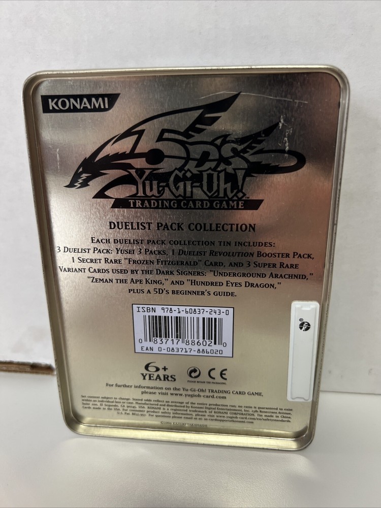 This collectible tin is a must-have for any Yugioh fan. The empty tin features various characters and is part of the Duelist Pack Collection. It was manufactured by Konami in 2007 and is compatible with English language cards. The tin is made of high-quality material and has one compartment. It is suitable for children aged 3-4 years and is perfect for storing cards or other collectibles. The Yugioh TV show and game are known for their unique and multicolor characters, making this tin a great addition to any collection.