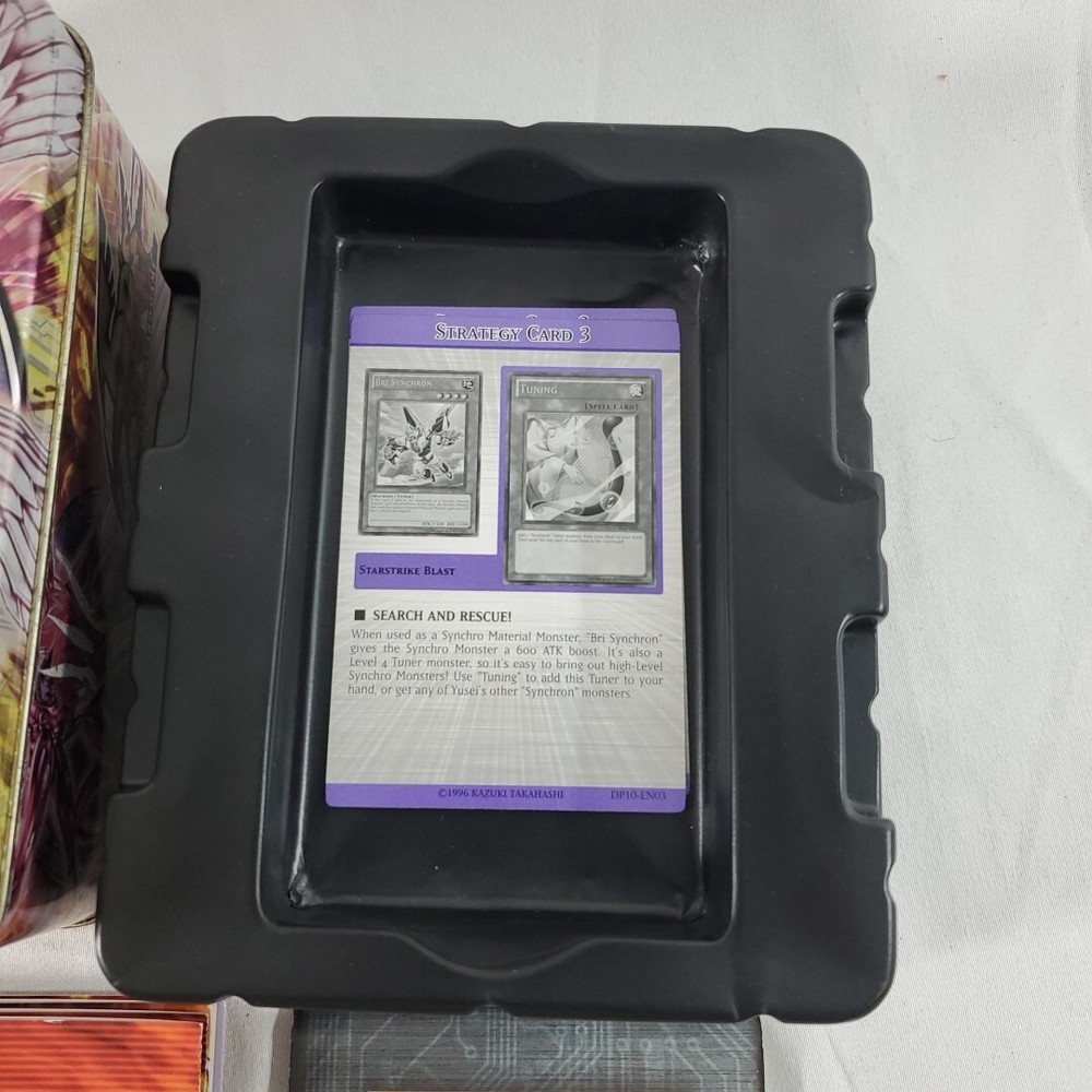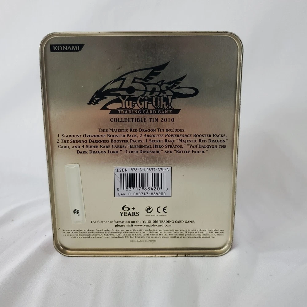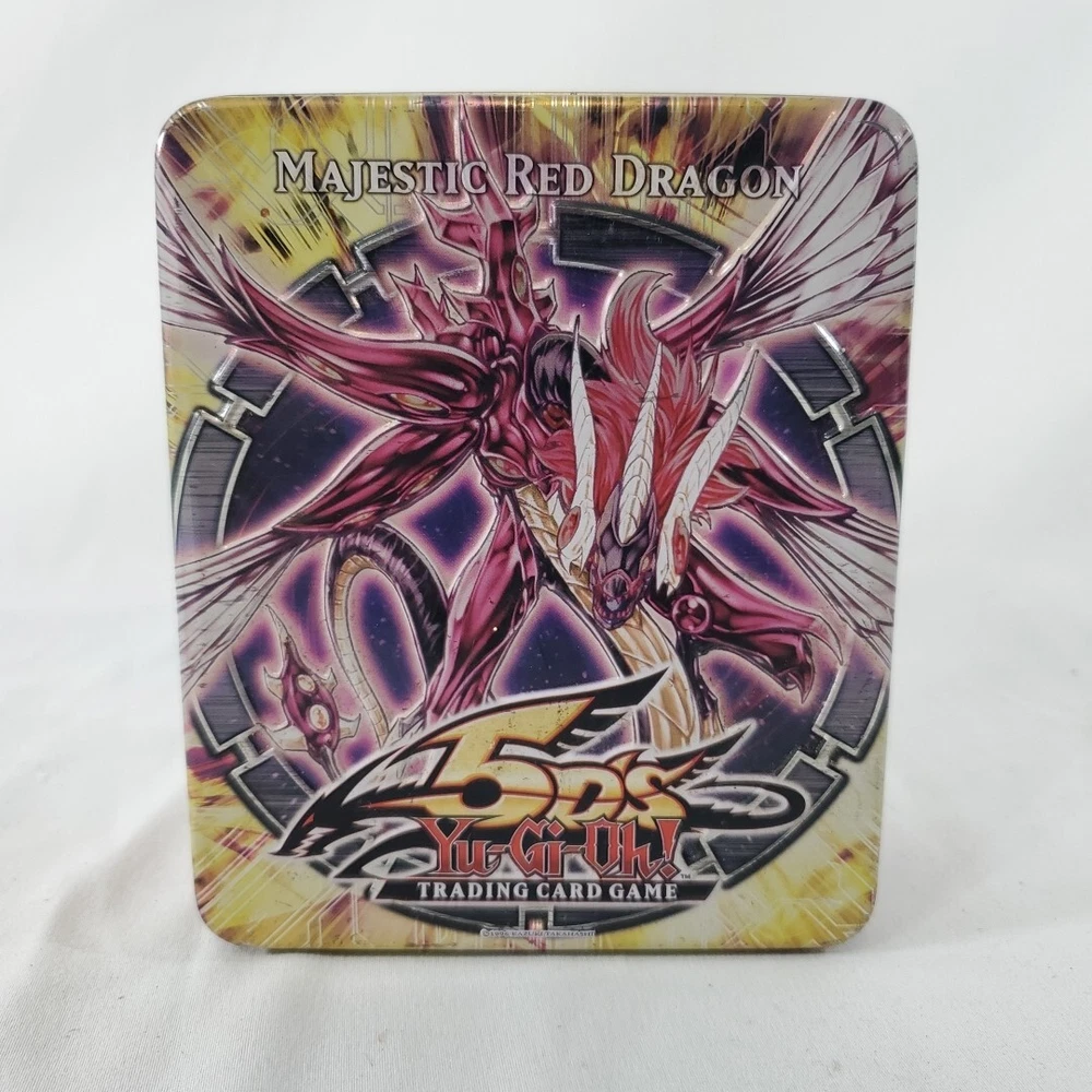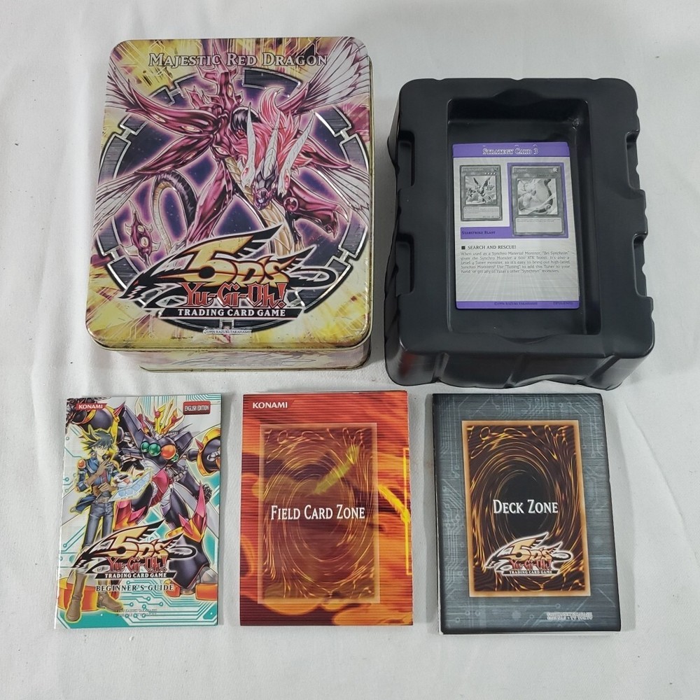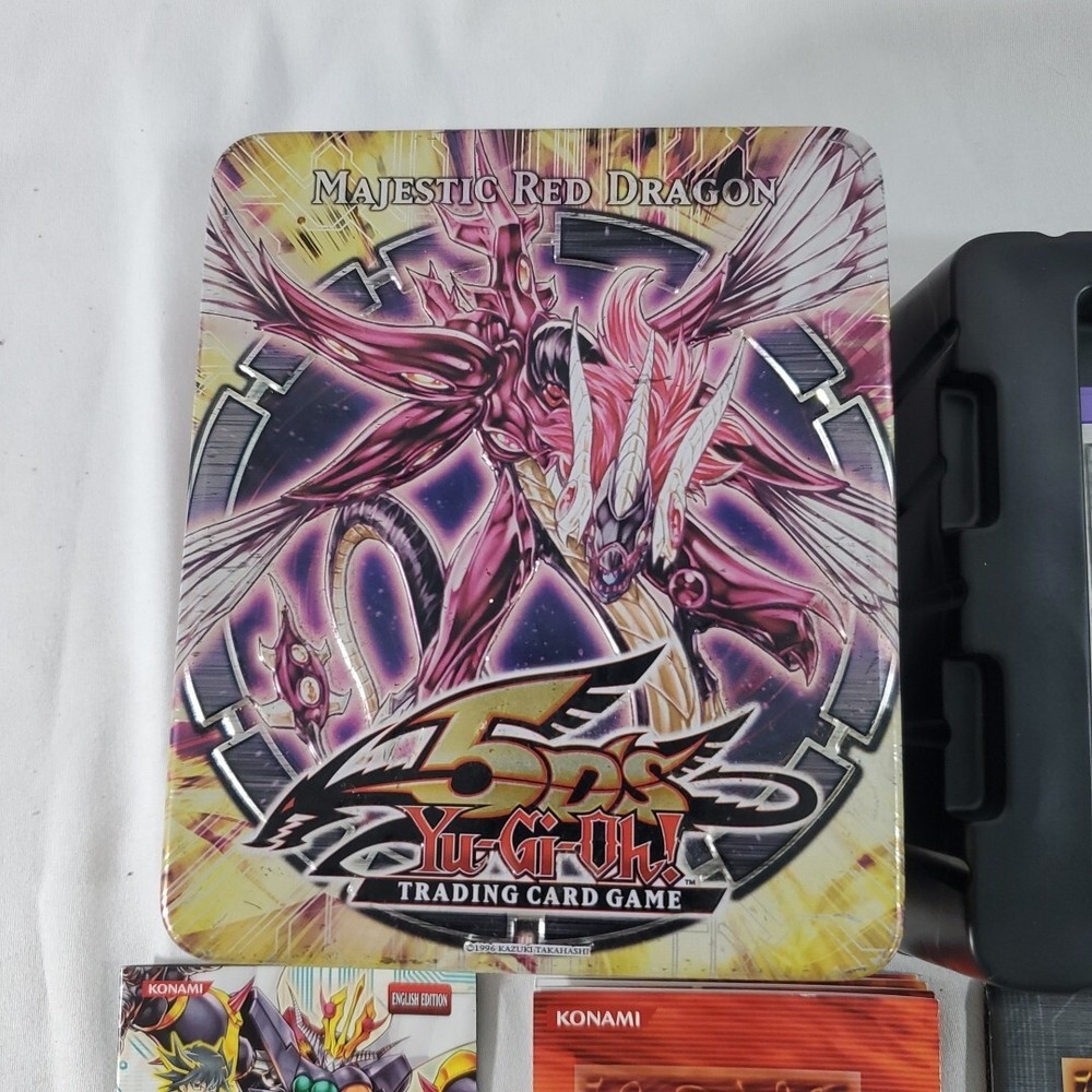 Yugioh 5ds Majestic Red Dragon EMPTY Collectible Tin ONLY +Beginners Guide, also throwing in Warriors Strike structure deck playing field foldout + other foldout - In Great Pre-Owned Condition, Minor Cosmetic Shelf Wear, Some surface scrating on top cover but no dents or serious wear. Great condition overall PLEASE USE PICTURES FOR FINAL DESCRIPTION THIS IS AN EMPTY TIN WITH SOME EXTRAS INCLUDED Will Receive All Items Pictured Please use all pictures for final description, check out our eBay store to see other great items and to view our feedback! SHIPS FAST AND FREE! This product is an empty collectible tin featuring the character Majestic Red Dragon from the Yu-Gi-Oh! 5D's TV show. It was manufactured by Konami in 2009 and is made of tin material. The tin is compatible with Yu-Gi-Oh! TCG cards, but the card capacity is not listed. The product includes a guide and a playmat field the Warrior's Strike set. It is branded by Yugioh and is in English language.