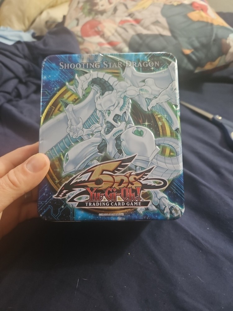 This collectible tin is a must-have for any Yu-Gi-Oh! 5D's fan. Featuring the iconic Shooting Star Dragon, this empty tin is perfect for storing your cards or other collectibles. With a card capacity of 930 ct, you'll have plenty of space for all your cards. Made of durable tin, this collectible item is built to last. The blue color and Dragon brand make it a great addition to any collection. This tin is compatible with Japanese card sizes and is perfect for any fan of the Yu-Gi-Oh! TV show. Add this unique item to your collection today!