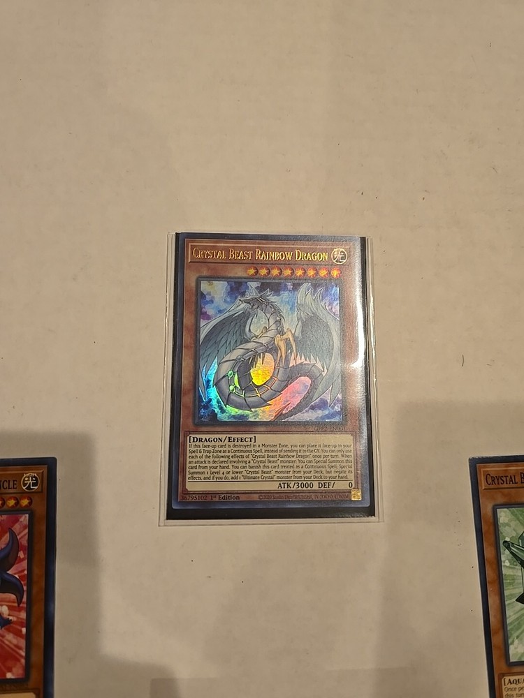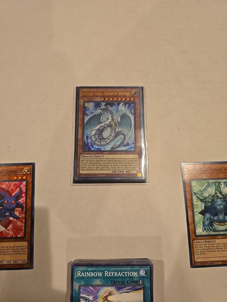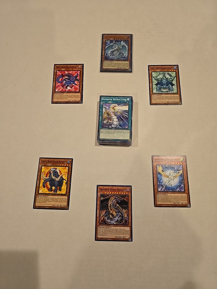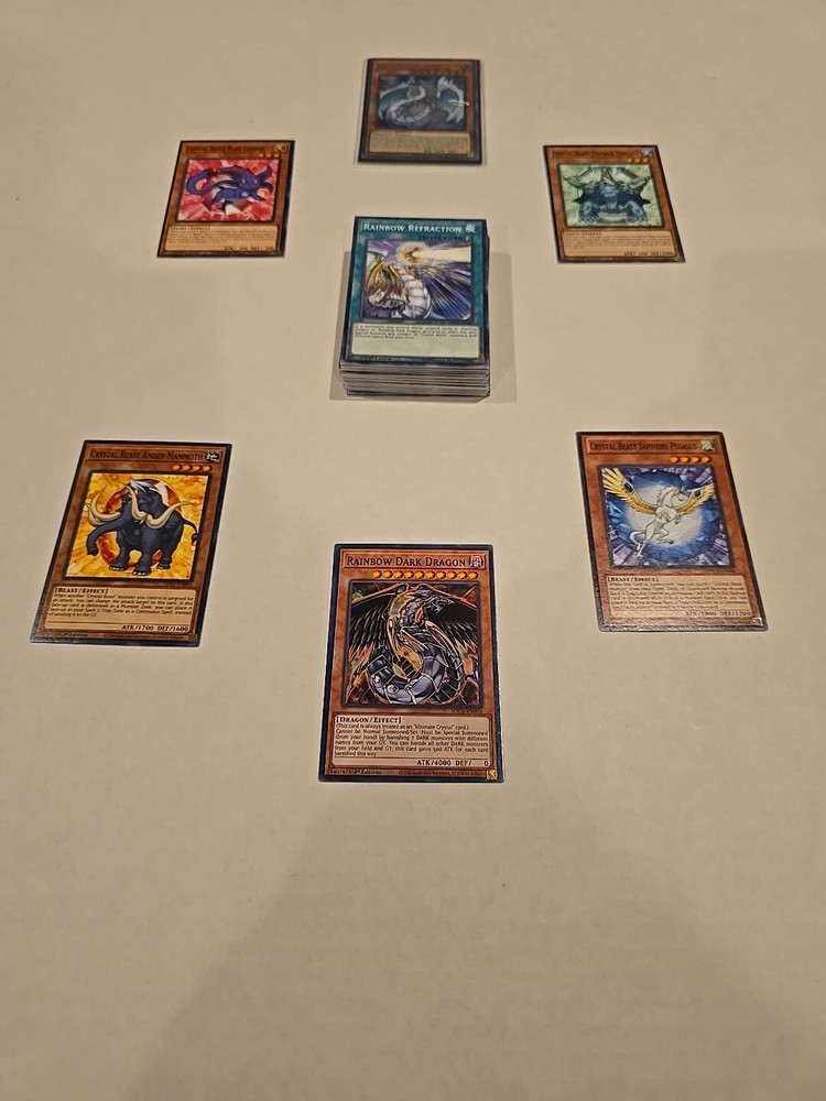 Jesse GX crystal beast themed deck Mostly Commons with holo rainbow dragon Around 75 cards, mostly NM condition There are TONS of duplicates, maybe half the lot is duplicates, PLEASE BE AWARE BEFORE BUYING!!! (ESTIMATE, numbers and conditions may be slightly off) TOTAL: 75 cards 1 Crystal Beast Sapphire Pegasus [RYMP] 1 Crystal Blessing [DP07] 1 Ancient City - Rainbow Ruins [DP07] 1 Crystal Promise [FOTB] 1 Crystal Master [MP19] 1 Rainbow Gravity [LODT] 1 Crystal Master [MP19] 2 Crystal Beacon [LDS1] 2 Rare Value [RYMP] 1 Crystal Beast Ruby Carbuncle [LDS1] 1 Crystal Beast Rainbow Dragon [GFP2] 1 Rare Value [OP07] 1 Crystal Beast Sapphire Pegasus [LDS1] 1 Crystal Beast Sapphire Pegasus [LDS1] 6 Crystal Conclave [FLOD] 14 Crystal Master [FLOD] 1 Crystal Blessing [SDCB] 1 Crystal Blessing [SDCB] 3 Crystal Tree [LDS1] 1 Crystal Beast Emerald Tortoise [LDS1] 1 Crystal Beast Amber Mammoth [LDS1] 1 Crystal Conclave [SDCB] 2 Crystal Beacon [SDCB] 9 Crystal Keeper [FLOD] 1 Crystal Abundance [FOTB] 1 Rainbow Dark Dragon [SDCB] 2 Crystal Promise [SDCB] 1 Rainbow Dark Dragon [SDCB] 1 Rainbow Bridge [SDCB] 1 Rainbow Dark Dragon [SDCB] 2 Rainbow Bridge [SDCB] 2 Rare Value [SDCB] 1 Crystal Tree [SDCB] 2 Crystal Tree [SDCB] 1 Crystal Abundance [SDCB] 2 Crystal Abundance [SDCB] 1 Rainbow Refraction [MP19] 1 Crystal Beacon [FOTB] 1 Crystal Beast Sapphire Pegasus [RYMP]