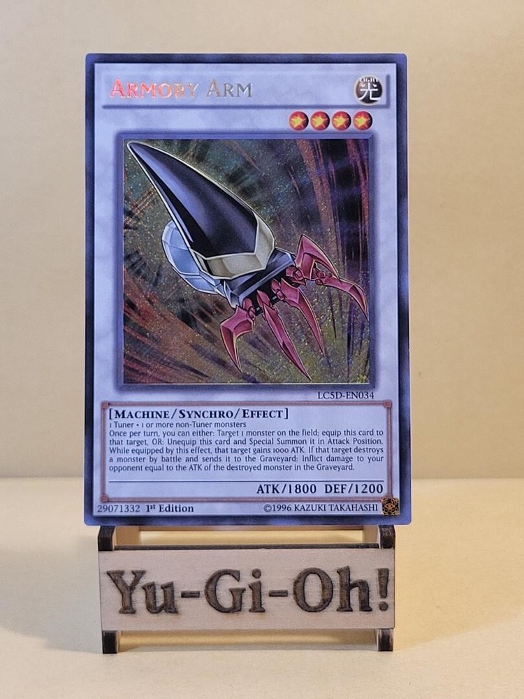 π΄ *Yu-Gi-Oh! Armory Arm - LC5D-EN034 - Secret Rare - 1st Edition - Near Mint (NM)* π΄ Enhance your collection with the powerful *Armory Arm* β Secret Rare, 1st Edition, Near Mint (NM) condition. The *Armory Arm* (LC5D-EN034) is a Secret Rare card from the *Yu-Gi-Oh!* trading card game. This 1st Edition card is in Near Mint (NM) condition, offering collectors and duelists a high-quality example of this unique Synchro Monster. Product Details: Card Name: Armory Arm Set: 5D's Starter Deck (LC5D-EN034) Card Type: Warrior / Synchro / Effect Monster Edition: 1st Edition Condition: Near Mint (NM) Rarity: Secret Rare Use: Collectible, Duel Play **Note: The display stand is not included** β οΈ Please Note: The condition of the card is based on personal observation. I am not a professional TCG card grader. Please review the photos and feel free to ask any questions before purchasing. You hold all responsibility in assessing the item before buying. Thank you! Why You'll Love This Card: *Armory Arm* is a fantastic Synchro Monster that not only boosts your monsters' power but also grants you the ability to equip it to another monster, increasing its effectiveness in battle. As a Secret Rare, this card is a prized possession for both competitive duelists and collectors. π **Helpful Tip:** Use the **Categories** filter on the left sidebar to explore other collectible Yu-Gi-Oh! cards, rare editions, and gameplay essentials to expand your collection. Shipping Information: Fast shipping available within the United States! Your Yu-Gi-Oh! card will be securely packaged to ensure safe delivery. πΊπΈ β οΈ **Important Shipping Note:** Please be aware that the local post office closes at noon on Saturdays and is closed all day on Sundays. Any purchases made on Saturday morning or evening may not be shipped until Monday. Customer Support: If you have any questions or concerns regarding your purchase, feel free to contact me! Iβm here to ensure your satisfaction. Accurate Representation: Be sure to check the photos for the product details and its condition. This *Armory Arm* card is in **Near Mint (NM)** condition. Handling Time: Expect processing and dispatch within TWO business days. Offers: Feel free to make an offer! I'm open to negotiations for this premium collectible card. πΈ More Photos? πΈ If you need additional details or images, just ask! Iβm committed to your satisfaction! π΄ Thank you for your interest. Add the *Armory Arm* to your Yu-Gi-Oh! collection today! π΄