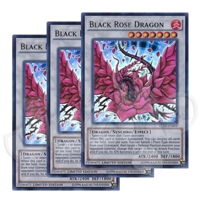 Black Rose Dragon x 3 1st Edition - Ultra Rare You will received 3 cards are they are in NM condition. Also will include a free Holographic card which can be a rarity of Super, Ultra, Secret, etc! Card Information 1 Tuner + 1 or more non-Tuner monsters When this card is Synchro Summoned, you can destroy all cards on the field. Once per turn, you can remove from play 1 Plant-Type monster from your Graveyard to change 1 Defense Position monster your opponent controls to face-up Attack Position, and reduce its ATK to 0 until the End Phase. Number: LC05-EN004 Rarity: Ultra Rare