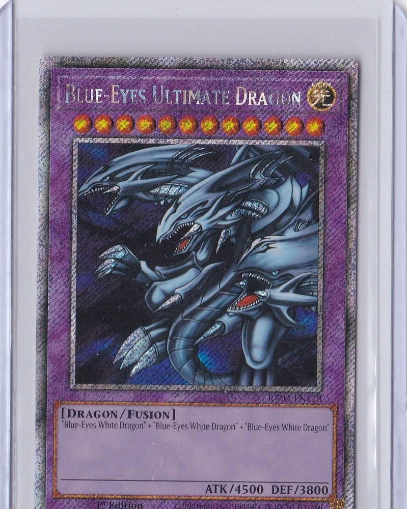 The Yugioh Blue-Eyes Ultimate Dragon RA03-EN178 1st Edition Platinum Secret Rare card is a highly sought-after collectible in the Yu-Gi-Oh! TCG World Championship set. With a striking blue attribute and holo finish, this monster card features an ultimate stage design and impressive defense and attack stats. Manufactured by Konami in the United States, this card showcases the iconic characters from the series such as Yami Yugi, Seto Kaiba, and Joey Wheeler, making it a valuable addition to any collector's deck.