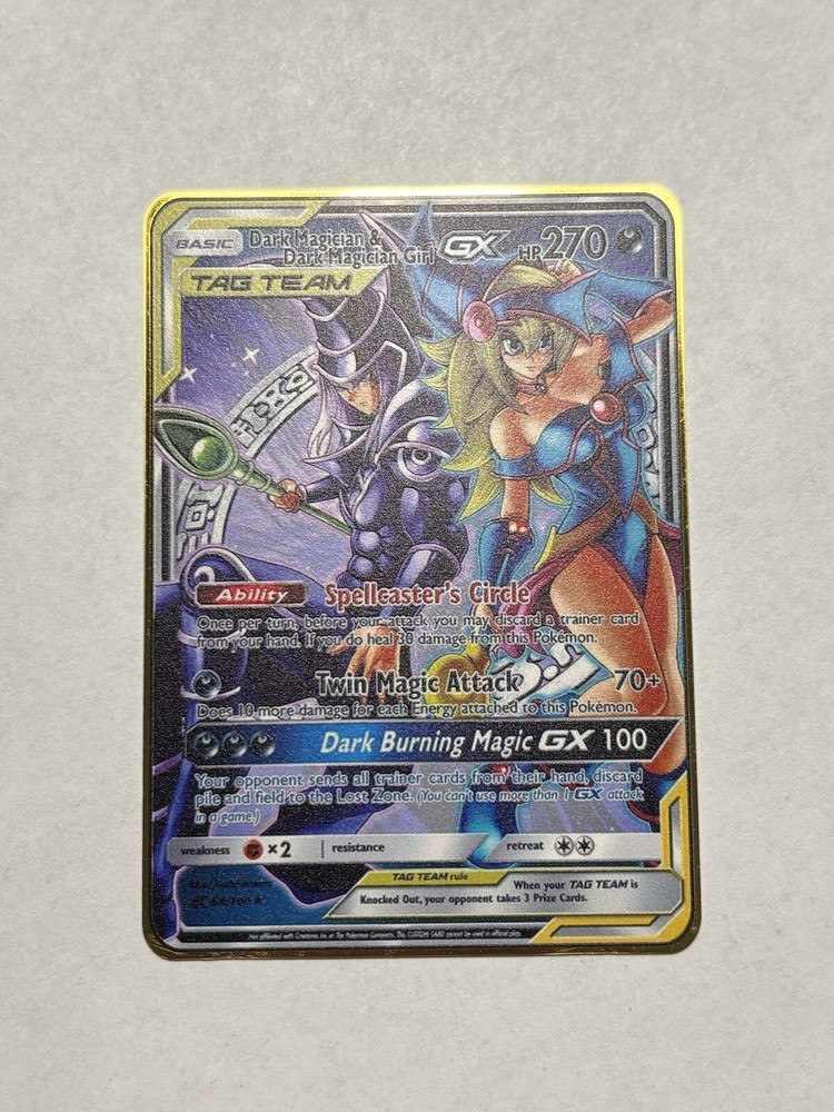 This limited edition Yugioh card features the iconic Dark Magician and Dark Magician Girl in a stunning gold metal finish. The card is a high-quality fan art piece, making it a must-have for any serious collector. The card is in near mint condition and has never been played. The Dark Magician & Dark Magician Girl GX card is an Artifact type card with a foil finish. It has a variety of special features, including exclusive, collector's edition, and unique art. The card is signed by 5ban Graphics and has a stage of Basic. It is a Gold rarity card with an English language and standard card size. Don't miss out on the chance to add this rare and special edition card to your collection.
