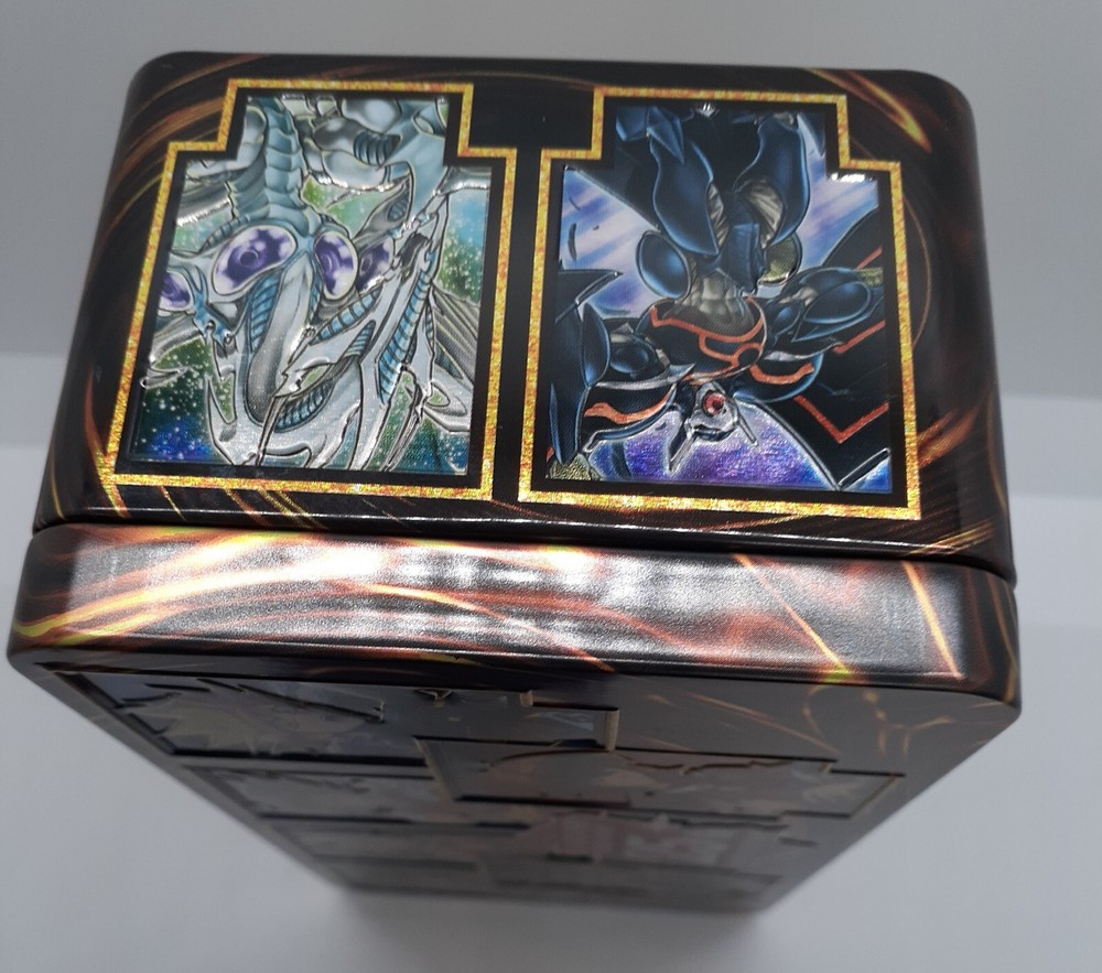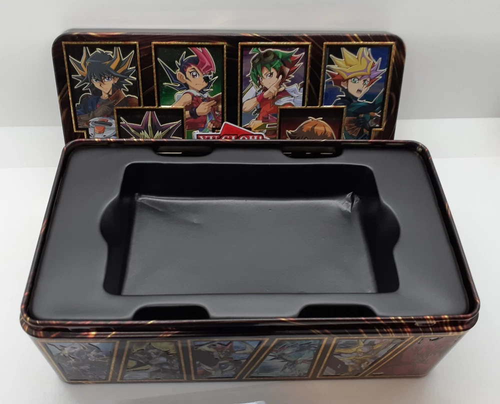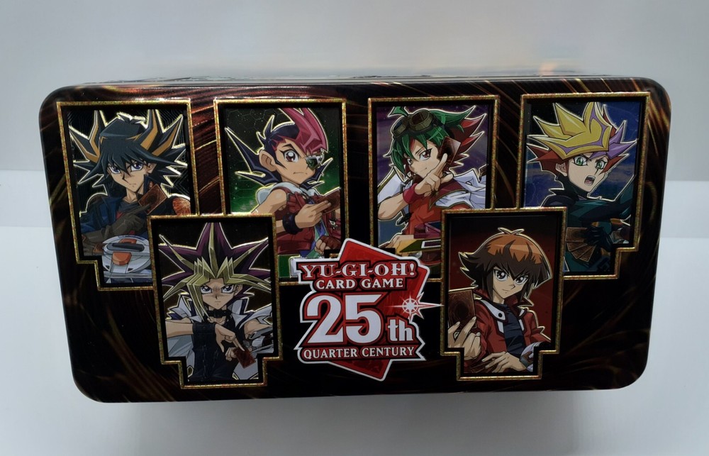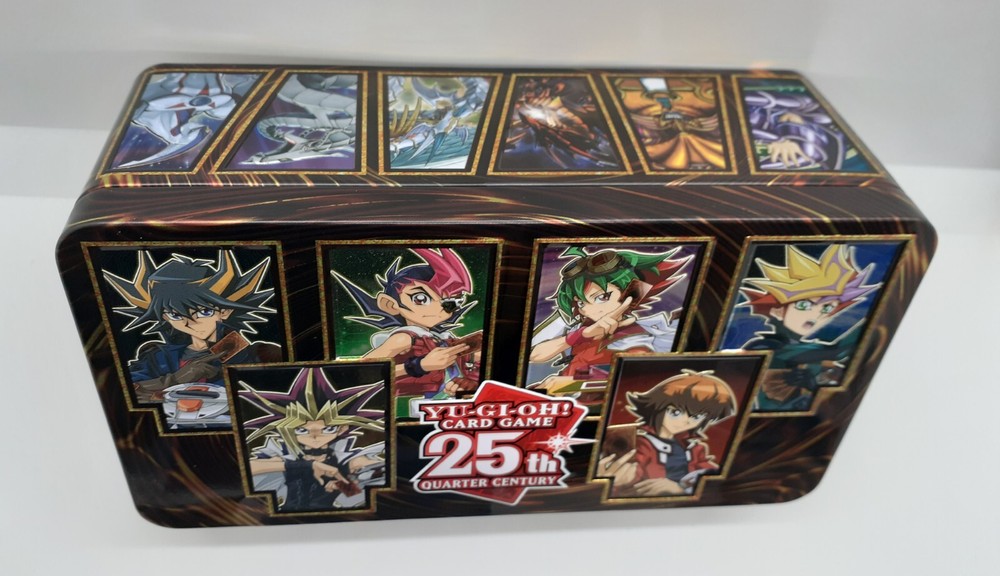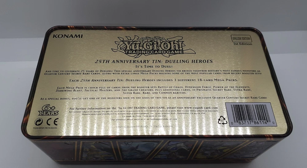 For all the Yu-Gi-Oh! TCG fans out there, this 25th Anniversary Tin: Dueling Heroes is a must-have. The tin is empty, but it is perfect for storing your favorite Yu-Gi-Oh! cards. The black and gold design with Yami Yugi, Joey Wheeler, Maximillion Pegasus, and Yugi Muto makes it a great addition to any collection. The language of the tin is English and it is manufactured by Konami in the United States. This tin is not vintage and was manufactured in 2023, making it a great option for younger fans with an age level of 4+.