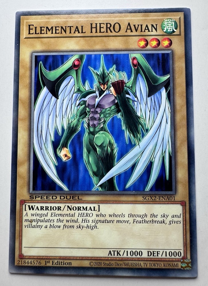 This is a Yu-Gi-Oh! card named "Elemental HERO Avian" from the set "Speed Duel GX: Midterm Paradox." It is a Common card with the Creature/Monster Type of Warrior. Manufactured by Konami, this 1st Edition card is part of the Speed Duel Starter Deck. The card number is SGX2-ENA01, suitable for ages 6 and up. It has a Regular finish.