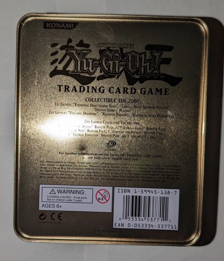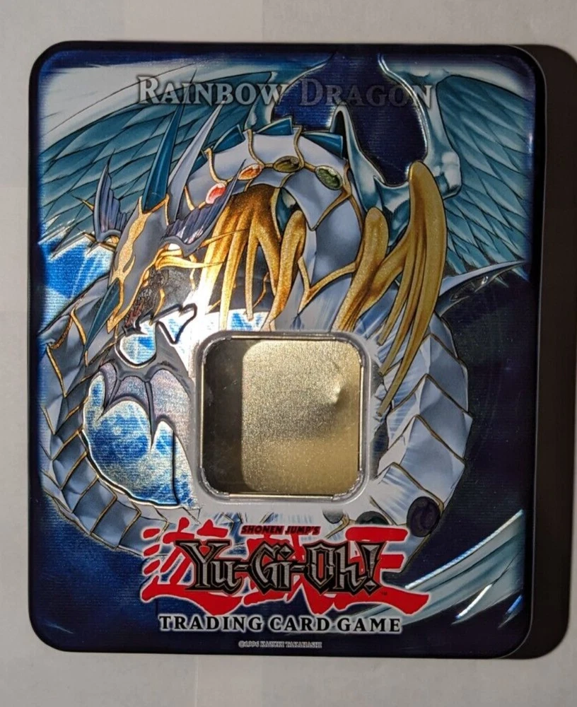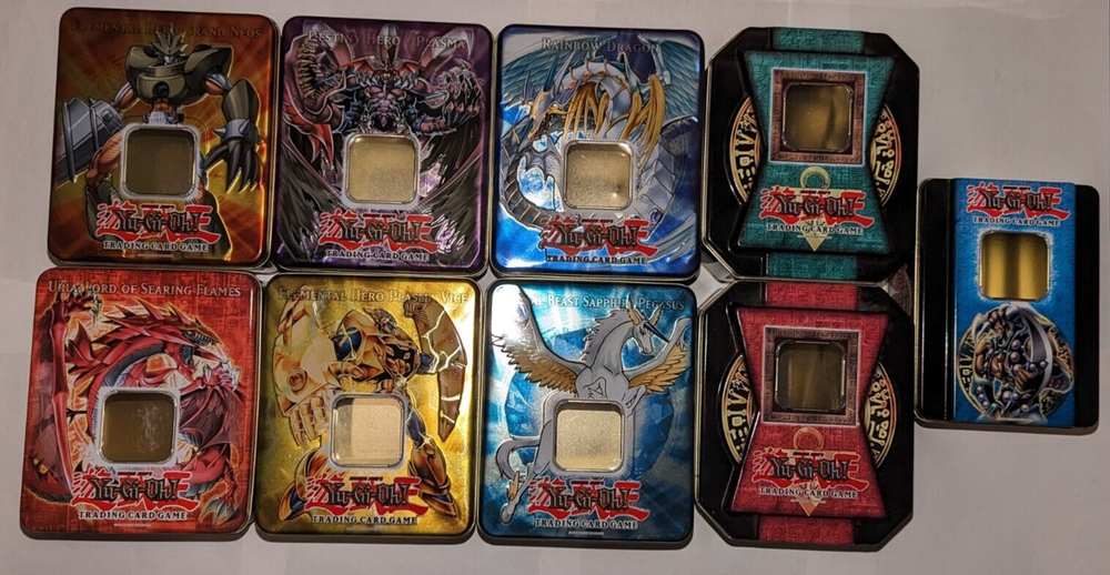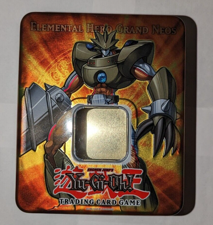 Yugioh Empty Tin Lot: All tins are in good condition! Elemental Hero Grand Neos tin has a scuff/scratch inside tin in Images 3 & 4. Rainbow Dragon tin has some small dents on the back side of tin in images 9 & 10. Uria tin has some bends on the front facing tin cover in images 16 & 17. The light brown cover of the tin in images 22 & 23 is very lightly dented. These items come from a smoke-free environment and I am the original owner of them. USA buyers only! Make sure to check out my other items and products I have for sale. Thank you!