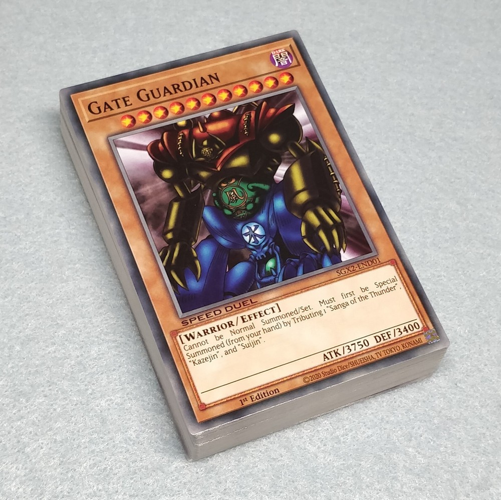 You will receive all of the cards listed. All cards are Speed Duel edition, and can be used in any Yu-Gi-Oh play format (including non-Speed Duel formats). All cards are in near-mint condition Monster (34): 1x Gate Guardian 1x Sanga of the Thunder 1x Suijin 1x Kazejin 3x Shadow Ghoul 3x Labyrinth Wall 3x Kaiser Sea Horse 3x Unshaven Angler 3x Jirai Gumo 3x Whirlwind Prodigy 3x Stone Statue of the Aztecs 3x Crass Clown 3x Dream Clown 3x Ryu-Kishin Clown Spell (12): 3x Fairy Meteor Crush 3x Soul Exchange 3x Disposable Learner Device 3x Tribute Doll Trap (6): 3x Judgment of Anubis 3x Labyrinth of Nightmare