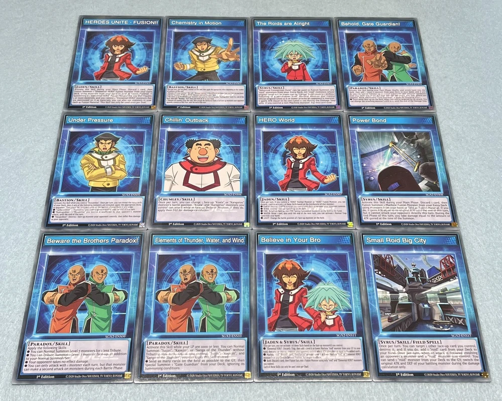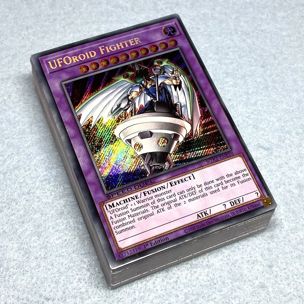 Listing includes the following: -One 78 card deck, featuring the most iconic cards used by Syrus Truesdale in Yu-Gi-Oh GX -1 secret rare holographic card (listed below) -20 random additional Yu-Gi-Oh cards -12 speed duel skill cards for use in the speed duel format (listed below) -One random official Konami Yu-Gi-Oh Dice All cards are Speed Duel edition, and can be used in any Yu-Gi-Oh play format (including non-Speed Duel formats). You will receive all of the cards listed. Secret Rare Holographic Cards (1): 1x UFORoid Fighter Monster (39): 3x UFORoid 3x Stealthroid 3x Cycroid 3x Gyroid 3x Steamroid 3x Drillroid 3x Truckroid 3x Mixeroid 3x Submarineroid 3x Rescueroid 3x Expressroid 3x Ambulanceroid 3x Mechanical Hound Spell (15): 3x Polymerization 3x Shield Crush 3x Weapon Change 3x Vehicroid Connection Zone 3x Twister Trap (9): 3x Emergeroid Call 3x Wonder Garage 3x Supercharge Extra Deck (15): 3x UFORoid Fighter 3x Steam Gyroid 3x Super Vehicroid Jumbo Drill 3x Super Vehicroid Stealth Union 3x Ambulance Rescueroid Skill Cards (12): 1x HEROES UNITE - FUSION!! 1x Chemistry in Motion 1x The Roids are Alright 1x Behold, Gate Guardian! 1x Under Pressure 1x Chillin' Outback 1x HERO World 1x Power Bond (Skill Card) 1x Beware the Brothers Paradox! 1x Elements of Thunder, Water, and Wind 1x Believe in your Bro 1x Small Roid Big City All cards are in near-mint condition