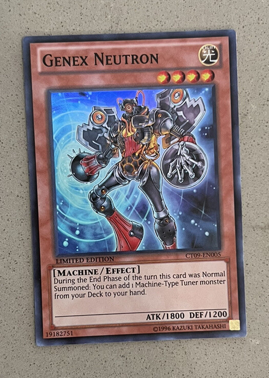 This Yu-Gi-Oh! TCG card is a must-have for any fan of the franchise. The Genex Neutron card features the rare and powerful Machine monster type, with a Light attribute and Holo finish, making it a valuable addition to any collection. This limited edition card, CT09-EN005, also includes speciality monster abilities that make it a formidable opponent in any game. The card showcases characters like Maximillion Pegasus, Yami Yugi, Joey Wheeler, and Yugi Muto, and belongs to the 5D's 2009 set manufactured by Konami. Although ungraded, this Super Rare card is in excellent condition and ready to bring excitement to its new owner's next Yu-Gi-Oh! TCG match.
