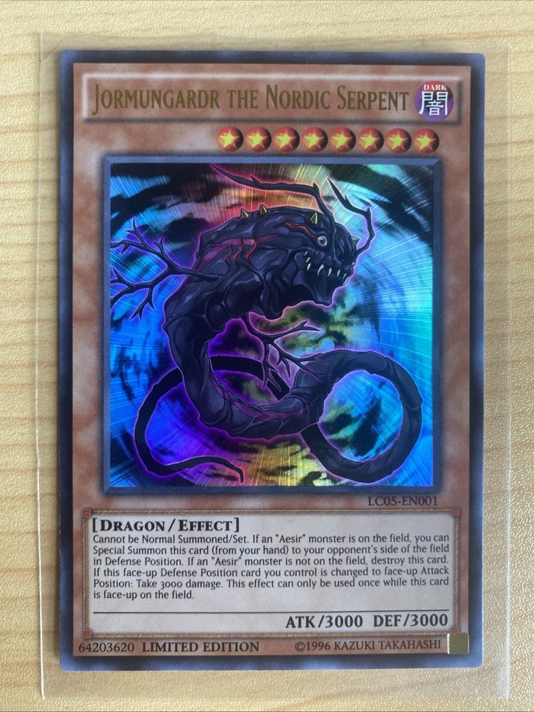 The product is a Yu-Gi-Oh trading card featuring Jormungardr the Nordic Serpent from the Legendary Collection 5D's set. This ultra rare limited edition card, numbered LC05-EN001, is highly sought after by collectors of non-sport trading cards. With its unique character and limited availability, it is a valuable addition to any Yu-Gi-Oh card collection.