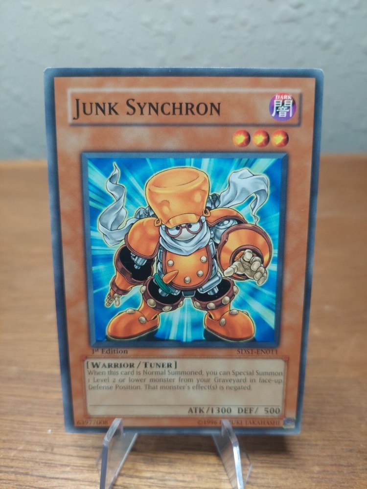 This Yu-Gi-Oh! card is a 1st edition Junk Synchron from the 5D's 2008 Starter Deck set. It is a common card with a regular finish and features the warrior creature type, dark color, and tuner monster speciality. The card is made of paper material and is in English language. It was manufactured by Konami in 1996 and is suitable for ages 6+. The card number is 5DS1-EN011 and it is a monster card type.
