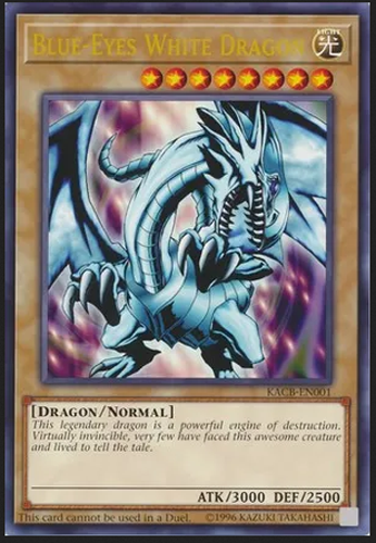 Description Condition: Mint / Near-Mint Availability: In Stock You are Purchasing Yugioh KACB-EN001 Blue-Eyes White Dragon Promo Card (Jumbo/Oversized Size) NM Size: 5-3/4" x 8" about the size of a DVD Case Cover. NOT TOURNAMENT LEGAL Payment Options Payment is expected within 7 days of your purchase date. We accept all forms of payments through Paypal. Shipping and Handling We ship to all U.S. states, U.S. territories, APO/FPO locations and any international countries listed under our "ship to" heading. Shipping and Handling is calculated based on the combined shipping weight of your item(s). Please use the shipping calculator to estimate your shipping and handling charges. In order to qualify for combined shipping terms, all items must be paid for in one payment; please do not pay until you are done bidding/shopping. Please contact us if you have any questions regarding our shipping and handling terms. Shipping and Delivery Packages are shipped out every Monday, Wednesday, and Friday. Domestic Packages take approximately 2-7 days to arrive. International packages may take a little longer to arrive, typically 1-4 weeks. Please allow ample transit times before inquiring about your package, thank you. Sales Tax All orders shipped to a California address will be subject to Sales Tax. Sales Tax is calculated on the item's price and is not applied to the shipping or other charges. Customer Service We will make every effort to get your purchase is mailed in a timely manner. Please contact us if you have any questions or concerns; we would love to hear any suggestions you have on how we can improve your eBay experience. Thank you for visiting us today.