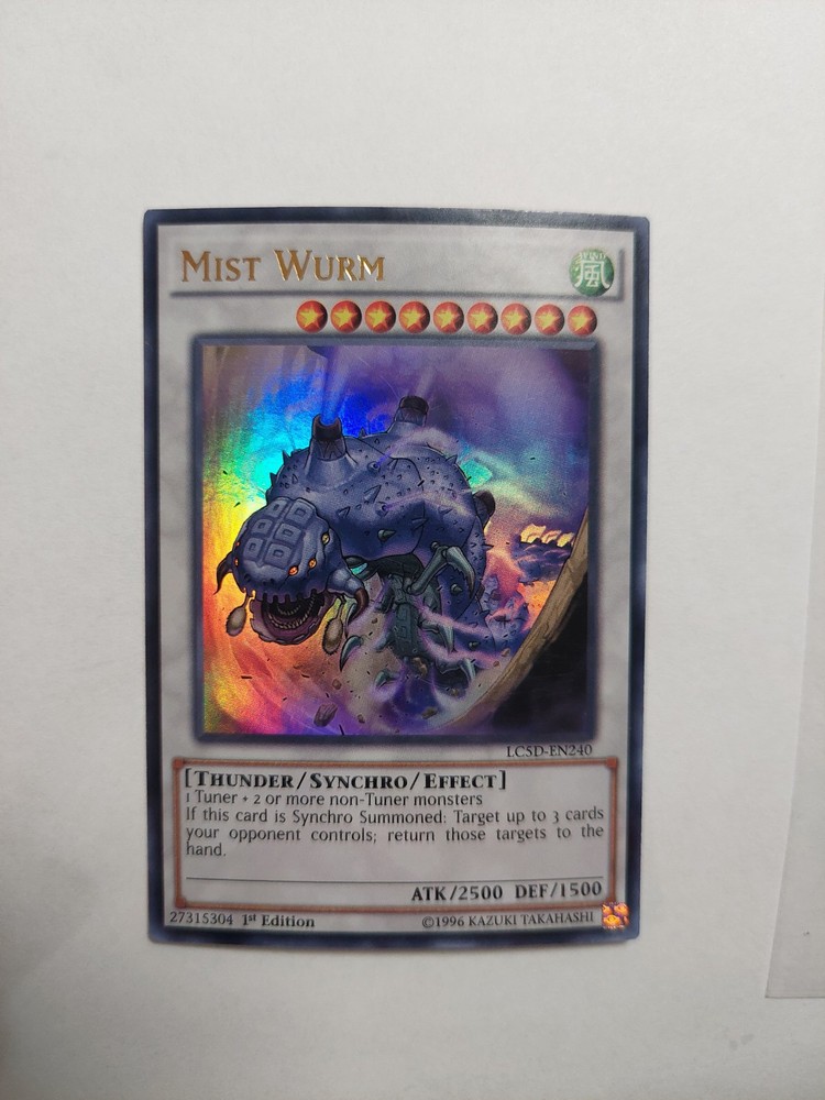 The product is a Yu-Gi-Oh! trading card featuring Mist Wurm from the Legendary Collection 5D's set. This Ultra Rare card is in English and has a foil finish, making it a sought-after collectible for fans of the game. It is a Synchro type card with the card number 240 and is a first edition release, adding to its value and appeal to collectors. The card showcases Mist Wurm, a Thunder-type creature, and is in Japanese card size.