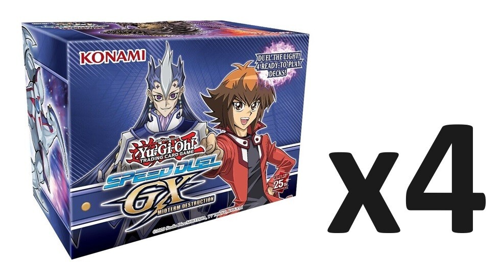 ALL ITEMS WE SELL ARE 100% AUTHENTIC. FACTORY SEALED!! This listing contains FOUR Speed Duel GX Midterm Destruction Mini-Boxes. Picture is just for reference unless otherwise stated. WE ONLY SHIP TO THE EBAY ADDRESS INCLUDED WITH YOUR PAYMENT! NO EXCEPTIONS! Returns/exchanges are not accepted. Get your game on and Duel the Light as we go back to Duel Academy in Speed Duel GX: Midterm Destruction!* The students at Duel Academy sure have been acting strangely since the mysterious Sartorius arrived on the island...Now it’s up to Jaden Yuki to find out how to stop his devious plans! Luckily, he has Elemental HERO Neos and the Neo-Spacians to help him out. But he’s not going in alone, because Tyranno Hassleberry is ready to back him up with the powerful Ultimate Tyranno! Jim “Crocodile” Cook is here too, ready to unearth whatever mysteries he may find with Fossil Skullgios! Will they stand a chance against Sartorius and his powerful Arcana Force monsters? The fate of Duel Academy will be decided in Speed Duel GX: Midterm Destruction! Speed Duel GX: Midterm Destruction introduces new cards and strategies from the Yu-Gi-Oh! GX animated series! With 4 complete Speed Duel Decks ready to play right out of the box, and over 90 cards new to Speed Duel, this is a collection Speed Duelists won’t want to miss! ★ Pre-built Decks for Jaden, Sartorius, Tyranno, and Jim! ★ Brand-new Skill Cards for new and returning Yu-Gi-Oh! GX characters! ★ Explore new strategies with additional cards included to upgrade the Speed Duel Decks from the Duel Academy Box; with new cards and Skills for Zane Truesdale, Aster Phoenix, and more! ★ Use your Speed Duel GX collection to build a new Deck! Dr. Crowler’s secret weapon – Belowski – makes his Speed Duel debut with Mokey Mokey King! ★ Discover 20 Secret Rare variants of popular GX-era cards to collect! Classic GX monsters like Neo-Spacian Aqua Dolphin, Dandylion, and Card Trooper arrive to Speed Duel as totally sweet Speed Duel Secret Rares! ★ Play with it on its own or Duel against the Speed Duel GX: Duel Academy Box, Speed Duel GX: Midterm Paradox, and Speed Duel GX: Duelists of Shadows sets! Each Speed Duel GX: Midterm Destruction Mini Box contains: • 100 Common Cards • 12 Skill Cards • 4 (of 20) Secret Rare Cards • one (1) Two-Player Jaden & Sartorius Deluxe Game Mat To use a card in Speed Duel it must have the Speed Duel Symbol on the card, cards without the Symbol are not legal, but Speed Duel cards can be used in the Yu-GiOh! TCG. Skill Cards may only be used in Speed Duel.