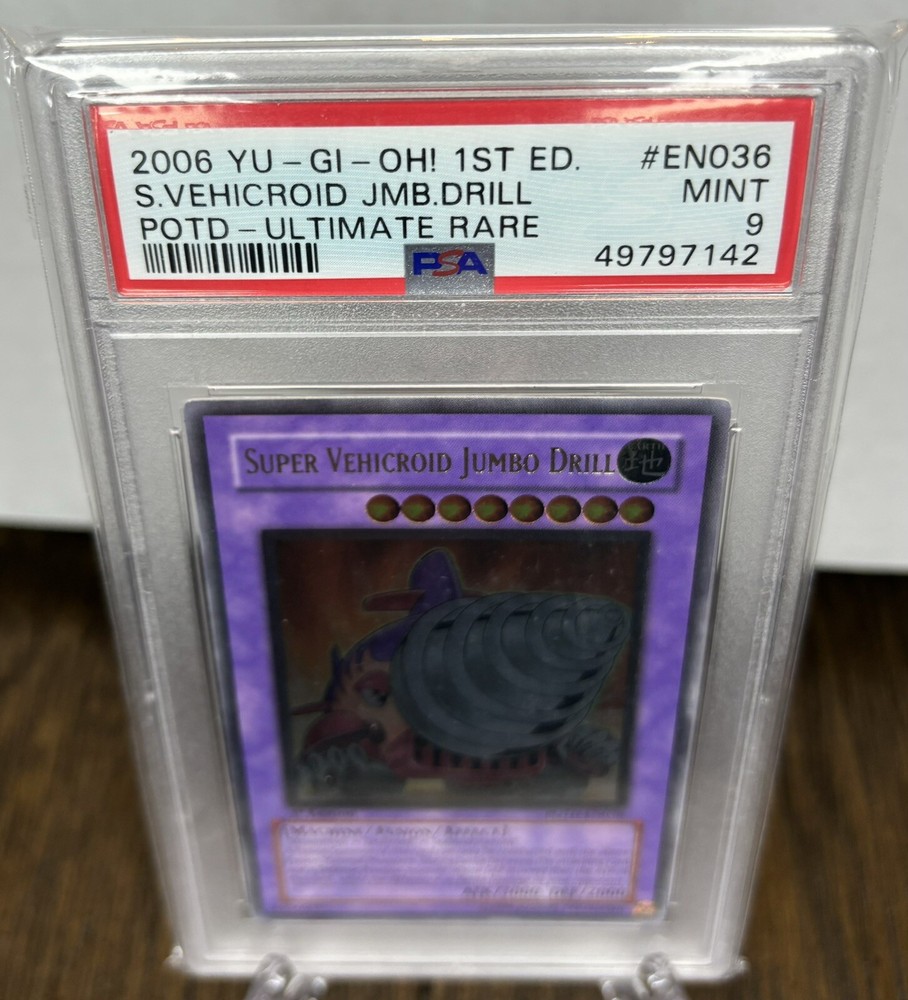 This rare and highly sought-after Yu-Gi-Oh! TCG card features the iconic character Super Vehicroid Jumbo Drill. The card is made of high-quality card stock with a holographic finish, and is a 1st Edition Ultimate Rare PSA 9. It is perfect for collectors and fans of the game alike, and is sure to make a great addition to any collection. The card is in English and was manufactured by Konami in the United States.