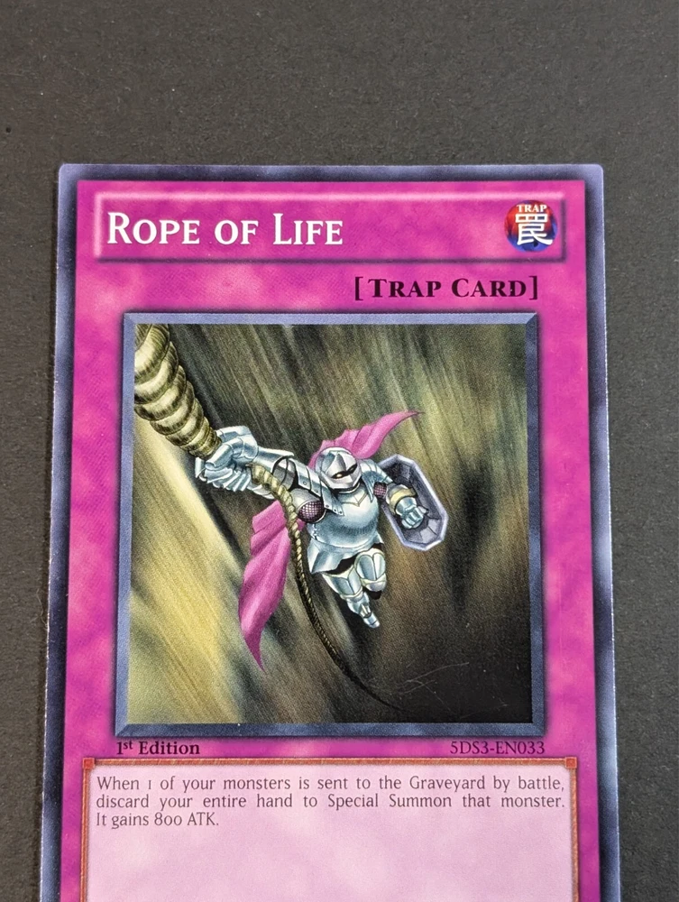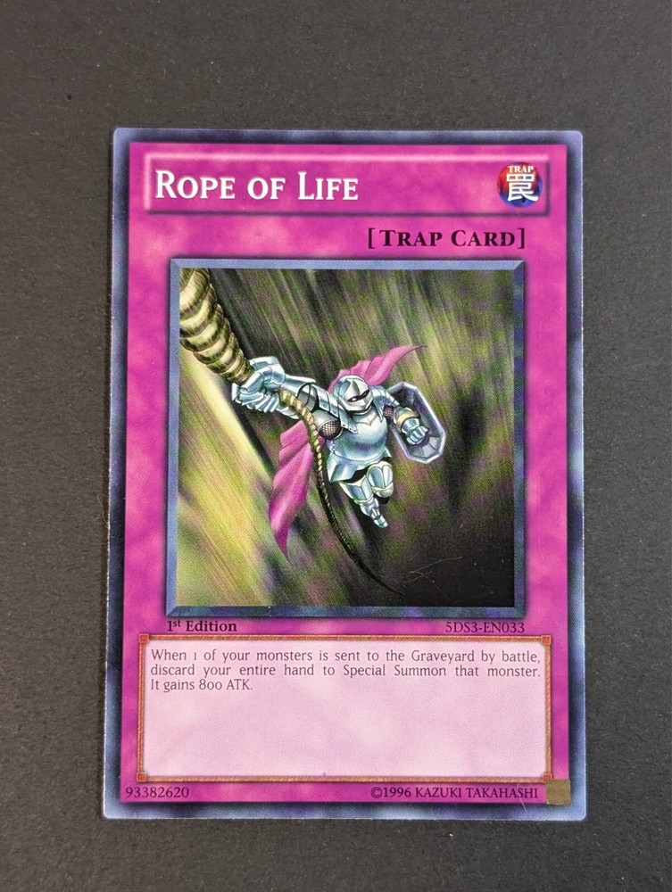 Yugioh TCG - 1x Rope of Life from the 5D's Duelist Toolbox set is a 1st Edition Common trap card featuring the character Rope. Illustrated by 5ban Graphics and manufactured by Konami in 2010, this English-language card is ideal for collectors and players of the Yu-Gi-Oh! Trading Card Game. With a standard card size and regular finish, this Trap card is part of the Starter Deck series, suitable for ages 8 and above. Add this vintage-themed card to your collection for a nostalgic touch to your CCG gameplay. Thank you for Visiting my store you can browse the rest of my items for sale here : https://www.ebay.ca/str/dragontreegames I offer combined shipping on all my trading cards for international customers to help offset shipping costs