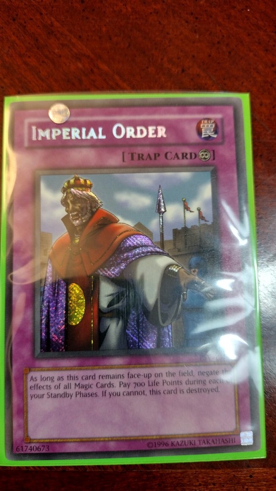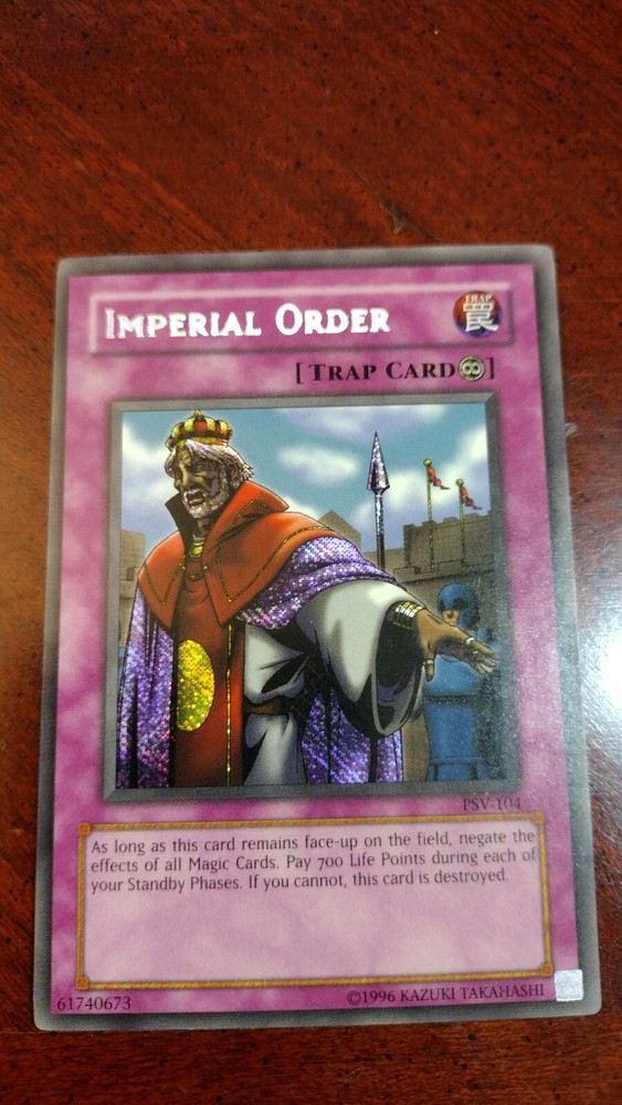 Not only a Misprint but also Never played Exceptional condition Mint to Near Mint. This rare and highly sought-after Yugioh TCG card is a must-have for any serious collector. With its stunning Imperial Order design, this Secret Rare card is sure to impress. Made from high-quality card stock and featuring a holographic finish, this card is a true gem. Part of the Pharaoh's Servant set and manufactured by Konami in the United States, this English language card is a Trap type GX Speciality card. Its vintage status and rarity make it a valuable addition to any collection. Don't miss out on the chance to own this incredible card!
