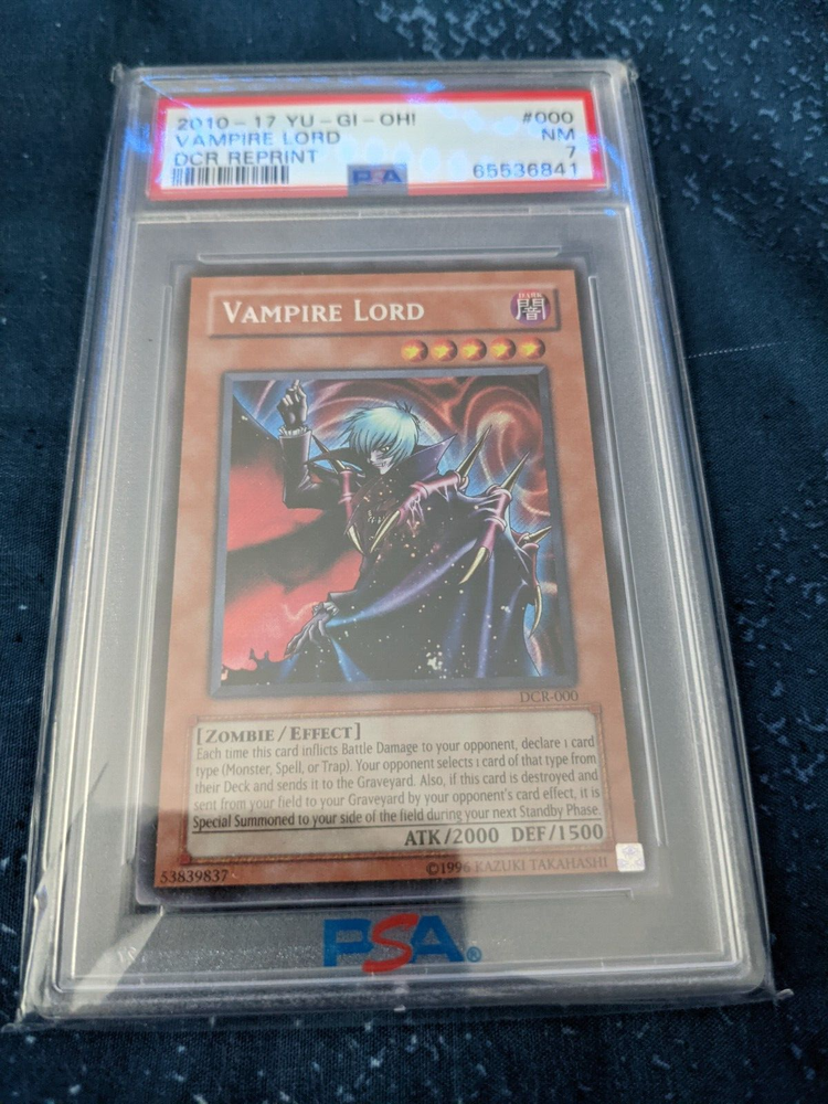 Yugioh TCG Vampire Lord PSA 7 2010 Secret Rare Reprint DCR-000 Holo NM All cards have beautiful cases and ship in PSA sleeves. As a collector, I understand the importance of shipping. Items will be very well protected and shipped with extreme care. Please message me with any questions or concerns. Also, please check out my other auctions of comics books, Yugioh cards. and Pokemon cards. Thank you! Priority Shipping