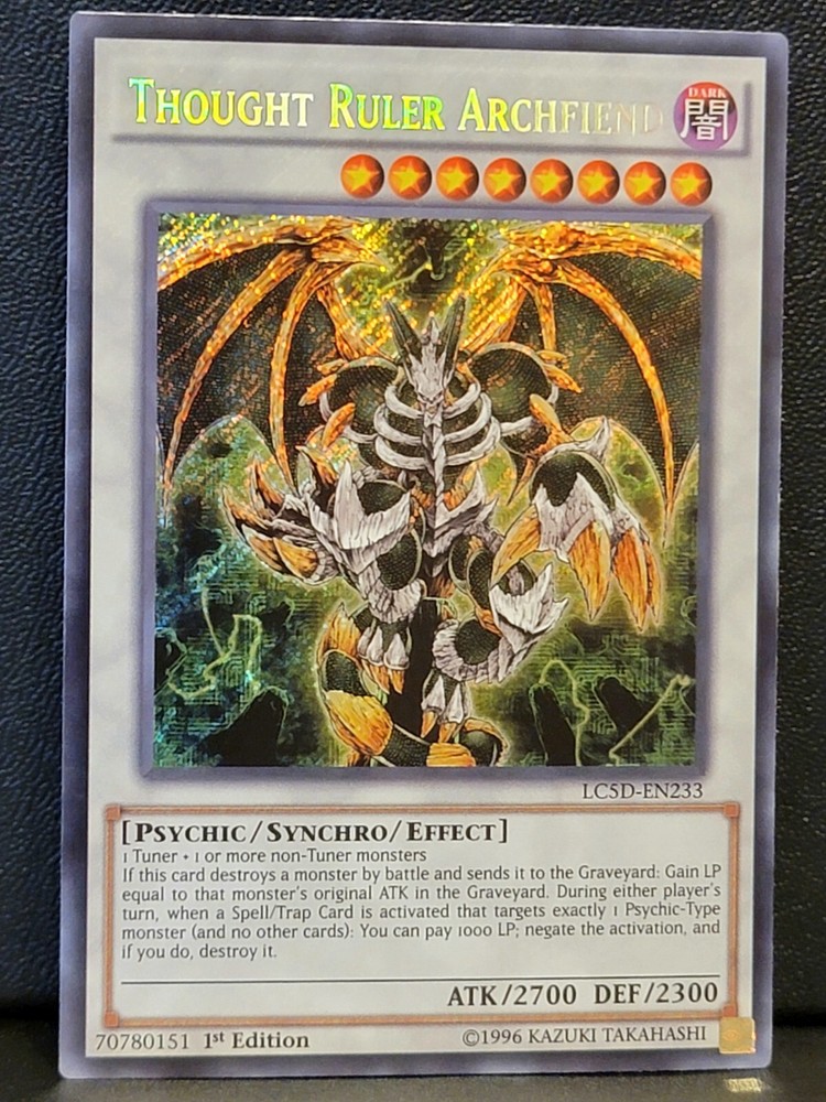 This unique and rare Yu-Gi-Oh! TCG card features the dark-colored Thought Ruler Archfiend with a psychic and archfiend creature/monster type. It is part of the Legendary Collection 5D's set and has a Secret Rare rarity. The card is a 1st Edition with a foil finish and unique art that makes it a great addition to any collection. The card type is Synchro and its card number is 233. Ideal for anyone aged 6+, this card is perfect for those who love collectible card games. Its features include a chase aspect, making it highly sought after. Despite being a first edition, this card is in near mint condition and ready for use. Add it to your collection today!