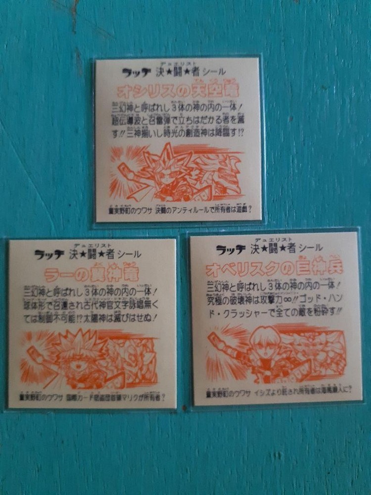 Yugioh Three God Cards Stickers Osiris Ra Obelisk Metal Foil 3pcs Rare Series Key Features Yugioh Three God Cards Custom Stickers Set - Osiris, Ra, Obelisk. This set features three popular series stickers, designed with metallic foil for a striking appearance. Each sticker is approximately the size of a Bikkuriman sticker, making them perfect for collectors and fans. These minor series stickers are sold as a set, ideal for display or trading. Item Specifics: - Brand: Yugioh - Type: Custom Stickers - Series: Three God Cards (Osiris, Ra, Obelisk) - Material: Metallic Foil - Size: Bikkuriman size (approximate) - Quantity: 3 pieces set - Condition: New (assumed, based on description) Specifications Brand No Brand Country Japan Franchise Yu-Gi-Oh! TV Show Yu-Gi-Oh! Color Multicolor Theme Anime,Manga Language Japanese Product Description Item Title Yu-Gi-Oh! Three Fantasy Gods Stickers Payment Supports managed payments Please pay within 5 days after auction is finished. About Us We are located in Japan. It's our pleasure to make you happy by proposing our recommend item. If you have any questions or request about items, please feel free to ask us. International Buyers - Please Note: -Import duties, taxes, and charges are not included in the item price or shipping charges. These charges are the buyer's responsibility. -Please check with your country's customs office to determine what these additional costs will be prior to bidding/buying. -These charges are normally collected by the delivering freight (shipping) company or when you pick the item up - do not confuse them for additional shipping charges. -We do not mark merchandise values below value or mark items as - gifts - The US and International government regulations prohibit such behavior. Thank you for your understanding.