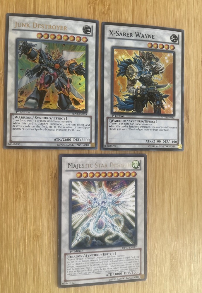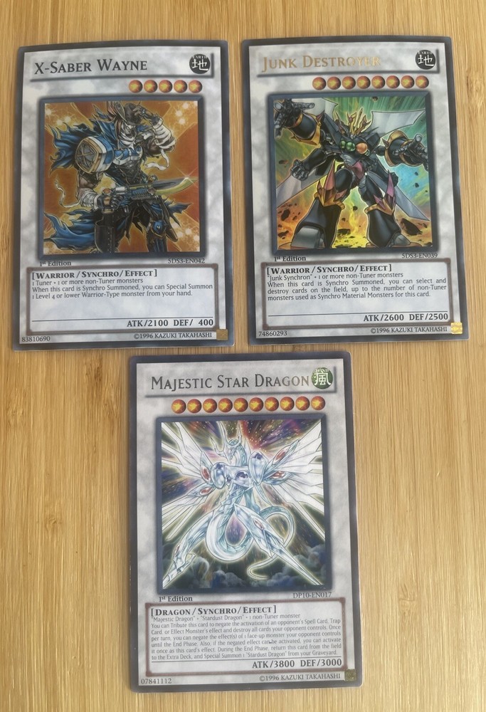 This lot consists of 3 rare and ultra rare 1st edition Yu-Gi-Oh! cards featuring dragons and warriors. The cards are from the Duelist Toolbox and Duelist Pack sets, manufactured by Konami in Japan in 2010 & 2011. They are in English and the 2 warrior cards have a holographic finish with the card names including Junk Destroyer, X-Saber Wayne, and Majestic Star Dragon. These vintage cards are highly sought after by collectors of the Yu-Gi-Oh! TCG for their unique character designs and special features. The Dragon card does not have a holo finish.