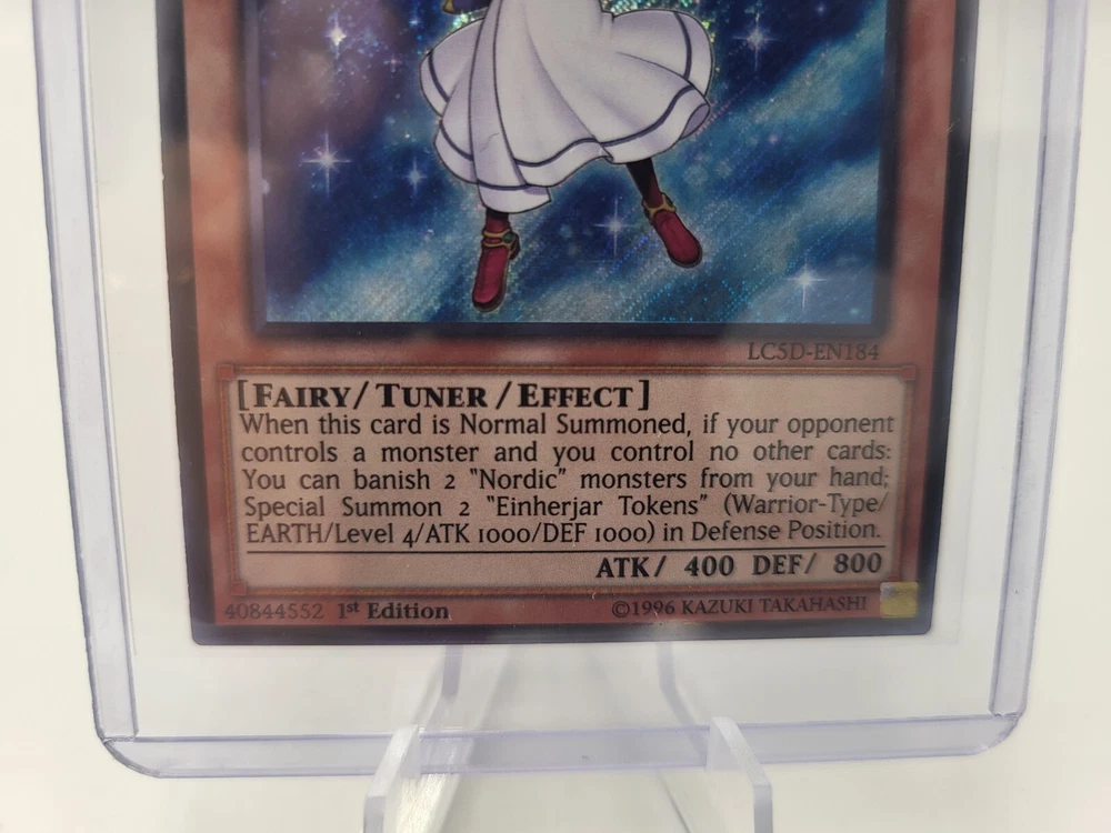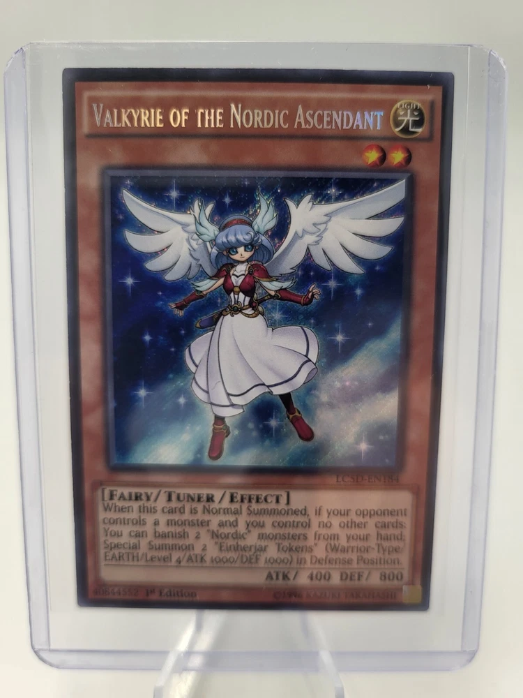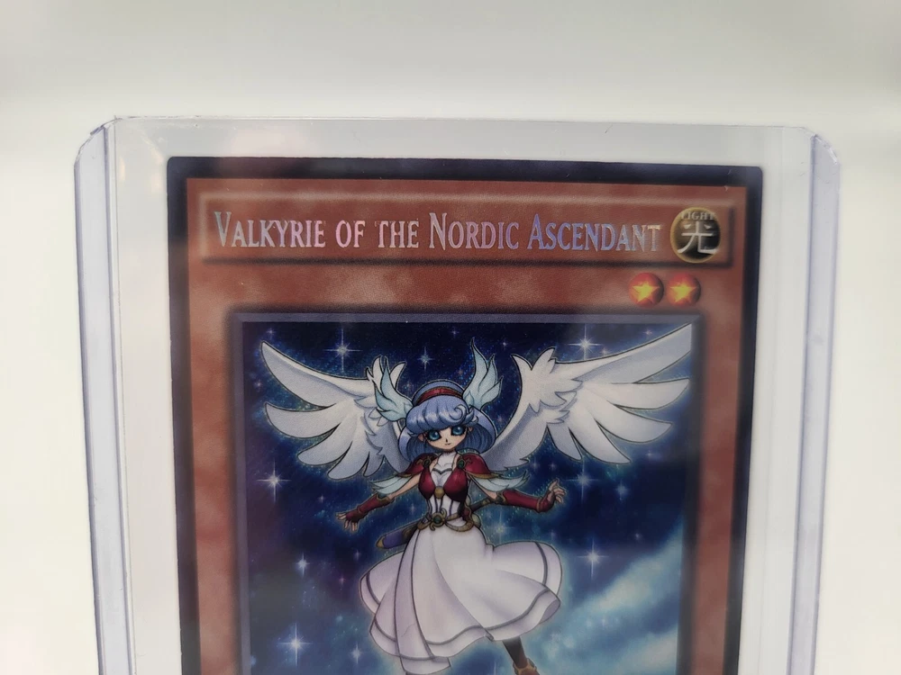 Yugioh! Valkyrie of the Nordic Ascendant from the Legendary Collection 5D's set is a rare and sought-after card for collectors and players alike. This Japanese card features a Fairy creature type and a Light attribute, with a stunning holo finish and Secret Rare rarity. Manufactured by Konami, this 1st Edition card is in English language and made of high-quality card stock material. A perfect addition to any Yu-Gi-Oh! TCG collection, this card is in near mint condition (NM) and ready to elevate your deck to new heights.