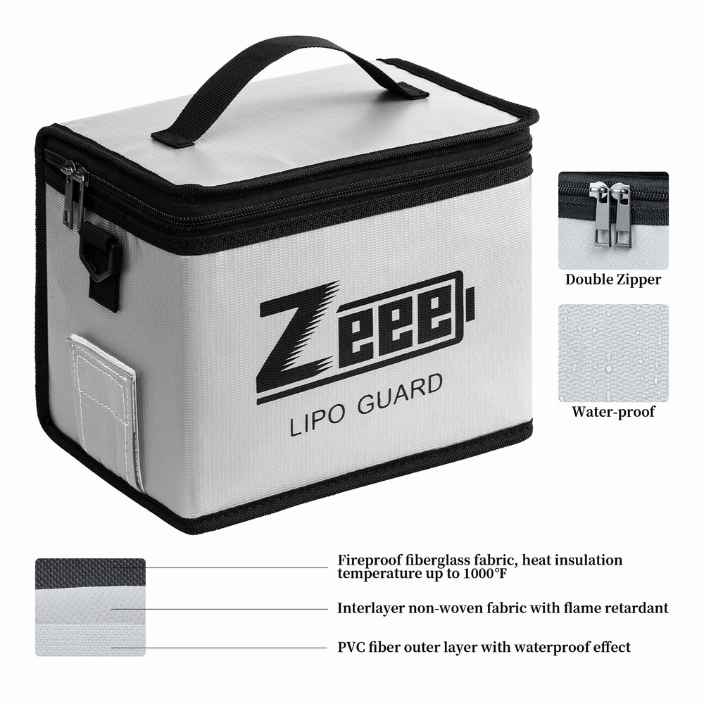 Zeee Fireproof Explosionproof Storage Guard Bag for Lipo Battery Charge& Storage Zeee Fireproof Explosionproof Large Capacity Battery Storage Guard Pouch for Lipo Charge & Storage (8.5 x 5.7 x 6.5 in) 【 Zeee LiPo Battery Bag Material 】 - 100% inner fireproof fabric, interlayer non-woven fabric with flame retardant effect, and PVC fiber outer layer, which effectively isolate air and improve the safety when charging. Heat insulation temperature up to 1000℉. Please note the bag can't prevent the fire if the temperature over 1000℉. In this situation, it is not 100% fireproof. 【 Safeguard LiPo Battery 】 - Zeee Fireproof LiPo Battery safe storage bag is a convenient way of safeguarding your Lipo batteries during charging, transit, and storage. The LIPO SAFE BAG is intended to reduce the chances of damage in the event of a lipo fire. 【 Easy to carry 】 - Zeee fireproof storage bag use for safely transporting, storing, and charging lipo batteries. 【 Large space 】 -Zeee explosionproof lipo safe bag can contain about 25pcs 3 Cells 2200mAh lipos, the dimension is L*W*H/215*145*165mm/8.5*5.7*6.5inch, Weight: 215g. 【 What You Get 】 - 1*Zeee Lipo Battery Safe Bag 【 Warning 】 Never leave charging battery unattended. Always ensure the battery is on a non-flammable surface. Ensure only the charging battery inside the bag and the lipo battery bag is sealed while charging. The LIPO SAFE BAG is intended to reduce the chances of damage in the event of a lipo fire. Payment Delivery details Terms of sales About us Contact us Payment 1. Credit Card 、Debit Card、Apple Pay、Google Pay and PayPal. 2. Buyer needs ship to other address should contact us before buy items. 3. Payment should be sent within 5 (Five) days of auction closing. Or unpaid dispute will be filed for closing auction. Delivery details 1. All items will be shipped to buyer's eBay address. Before you pay, please make sure your address on eBay matches the address you would like us to ship to. 2. All items will be shipped within 2 business day upon receipt of payment. 3. Items will be sent from USA directly, it usually takes approximately 4-7 business days to receive order. Terms of sales 1. Our items come with 180-Day warranty. 2. Our warranty does not extended to any products that are physically damaged or that are not under normal operating conditions as a result of misuse or improper installation on the buyer/user's part. 3. This product comes with 30-Day Money Back Guarantee. 4. We stand behind every product we sell. If you're not pleased with your purchase, we'll be happy to make an exchange or refund. About us Zeee Power is one of the largest Lipo battery manufacturer around the world, which is focus on research, development and production of Li-Polymer batteries for over decades. We are committed to provide more professional and safer batteries for every consumer. Our company import the most advanced production technology and strict QC teams to control the quality and security of batteries. Zeee Power Lipo batteries provide flat discharge curve, excellent performance at low temperature and high discharge rate, to reach the top speed with the most stability and power your rc models. Contact us Please contact us in time if there is any further question or suggestion, we will reply you within 24 hours. Please add our store "zeee_power_direct" to your favorite seller list, and hope you have a good shopping experience in our store.Thank you so much for your support!