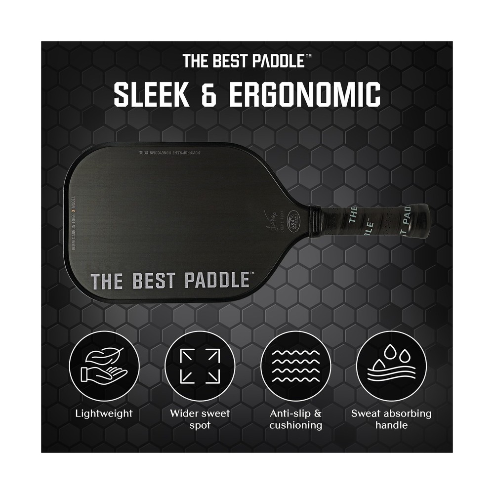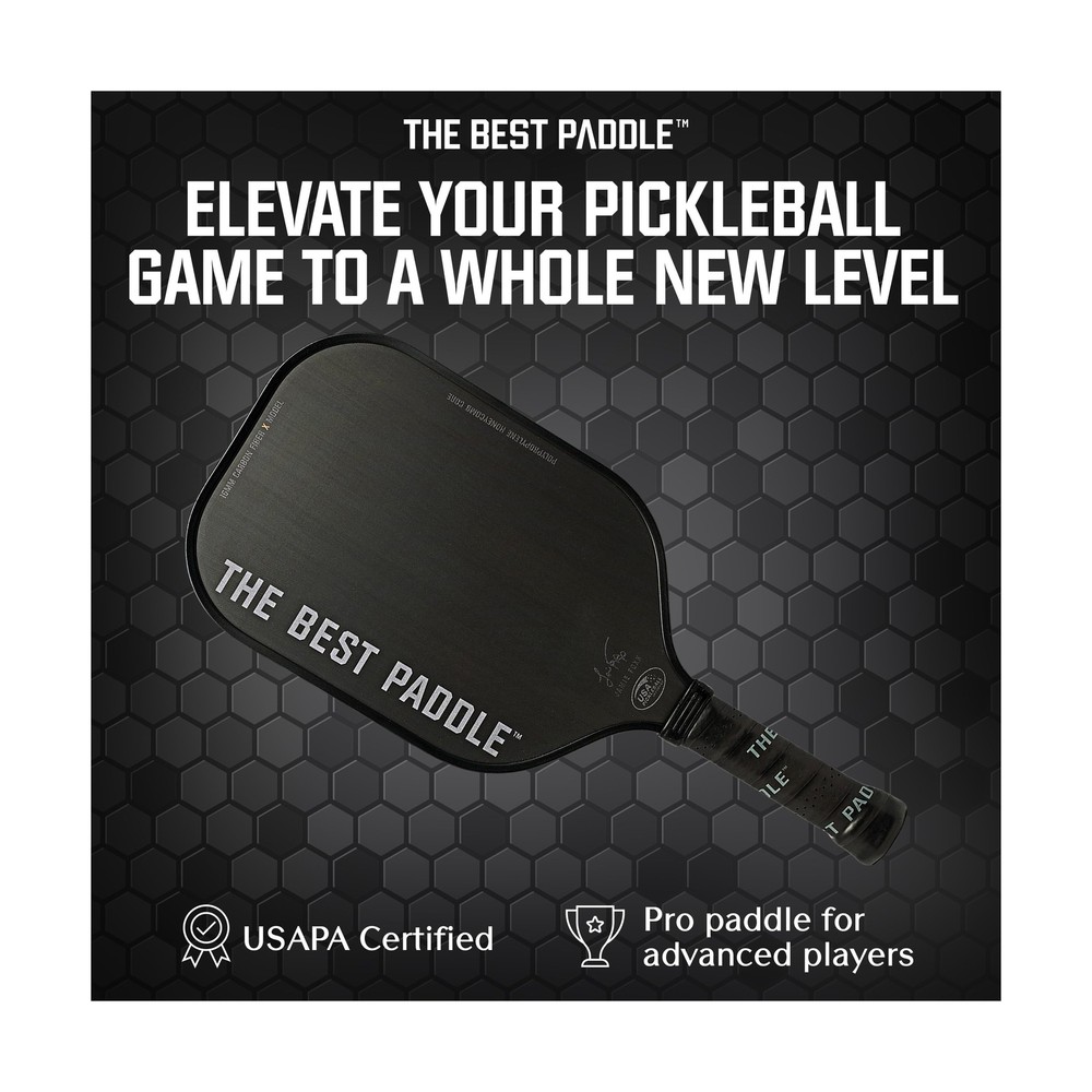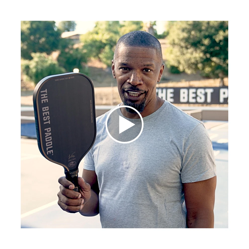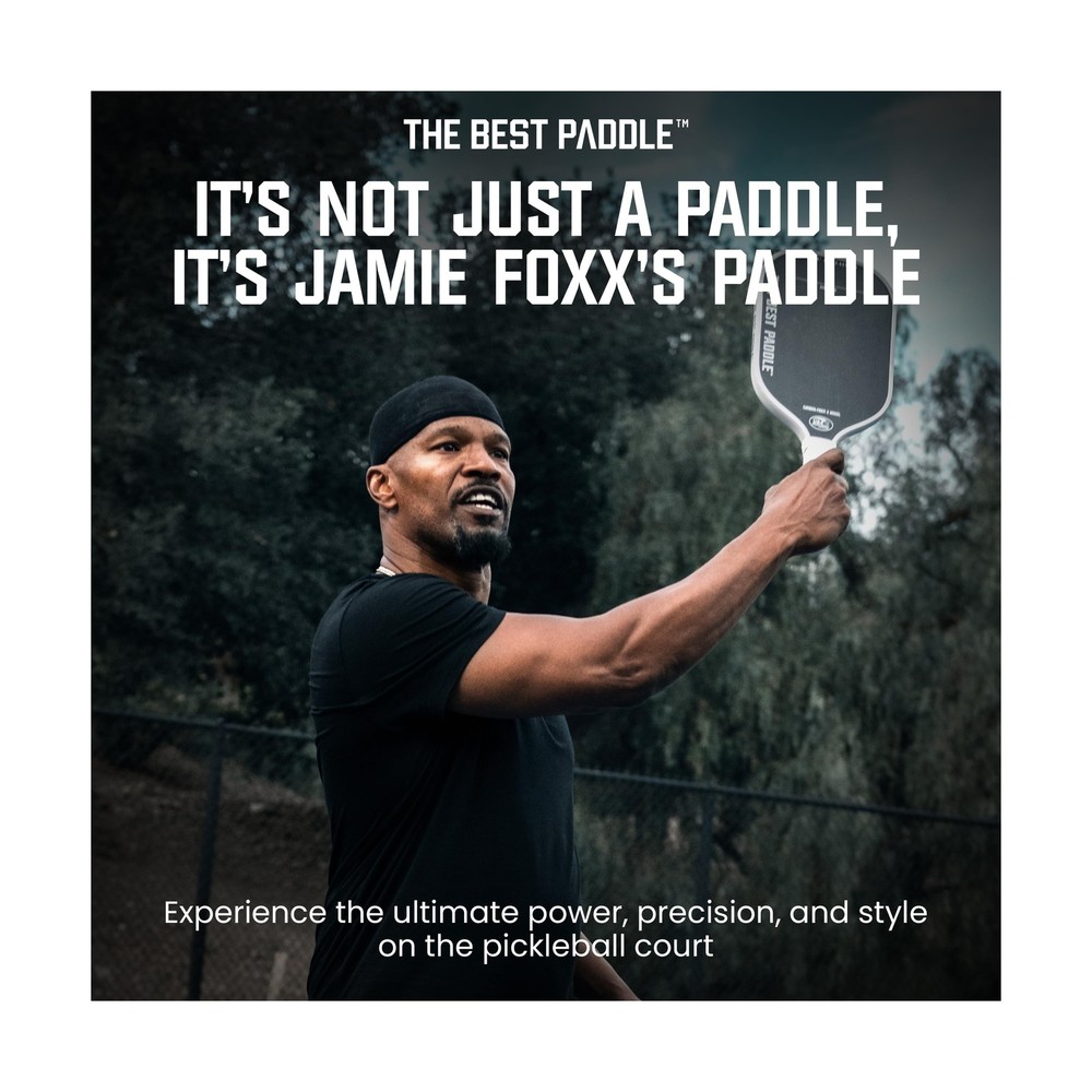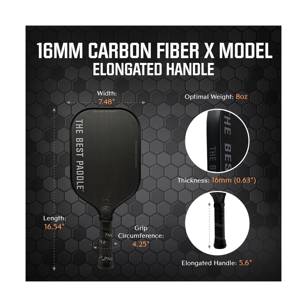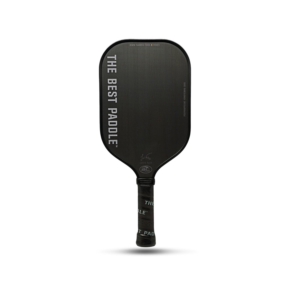 by Jamie Foxx USAPA Certified Pickleball Paddles - Carbon Fiber, 16mm Polymer Pickle Ball Racket for Power and Control - Elongated Handle - Buy Now with Fast Shipping! by Jamie Foxx USAPA Certified Pickleball Paddles - Carbon Fiber, 16mm Polymer Pickle Ball Racket for Power and Control - Elongated Handle Product Details Size: One Size Brand: The Best Paddle Sport: Pickleball Material: Carbon Fiber Skill Level: All Frame Material: Carbon Fiber Product Dimensions: 16.54"L x 7.48"W UPC Size: One Size Brand: The Best Paddle Sport: Pickleball Material: Carbon Fiber Skill Level: All Frame Material: Carbon Fiber Product Dimensions: 16.54"L x 7.48"W UPC: 769293770563 Item Package Dimensions L x W x H: 18.4 x 10.1 x 2 inches Package Weight: 0.73 Kilograms Item Dimensions LxWxH: 16.54 x 7.48 x 0.04 inches Brand Name: The Best Paddle Color: Black Manufacturer: The Best Paddle Part Number: Style: 16mm X Elongated Handle Date First Available: August 2, 2023 Key Features ✅ Tailored for advanced players - Maximize your game with our pickleball paddle's 16.54" length for extended reach, 7.48" width for broad hits, and 5.6" elongated grip length for optimal control and maneuver. Perfect for advanced and pro pickleball players. ✅ Experience superior game control - Our pickleball paddle has a raw T200 carbon fiber for enhanced spin and precise shot placement. Ideal for pickleball players who want a lightweight, durable paddle with a larger sweet spot for consistent performance. ✅ Premium quality with comfort - It features polypropylene honeycomb core, high-quality surface, perfectly-sized handle, and a soft, sweat-absorbing grip. All of these contribute to enhanced fun, fitness, performance and functionality. ✅ Officially sanctioned for tournament play - Our picklepaddle has been certified by USAPA/USA Pickleball Association making it the preferred choice for competitive players who seek equipment that meets professional standards. ✅ Pursue excellence with The Best Paddle in Pickleball - redefining the game with style, performance, and endurance. Our craftsmanship inspires players of all levels. Infused with Jamie Foxx's passion, our paddles symbolizes dedication to mastering pickleball. Product Description