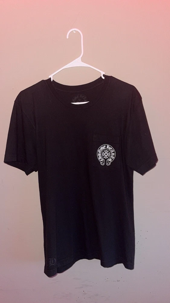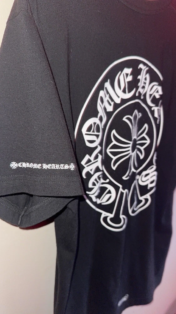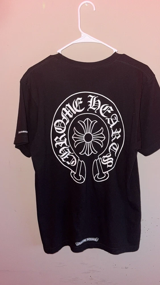 The product is a Chrome Hearts t-shirt in size M for men, featuring a horseshoe design. The t-shirt is in black color and falls under the regular size type. As a stylish and edgy piece from Chrome Hearts, known for its luxury and unique designs, this t-shirt is a versatile addition to any wardrobe. Perfect for casual wear, the Chrome Hearts horseshoe t-shirt offers a blend of sophistication and urban style for men looking to make a fashion statement.