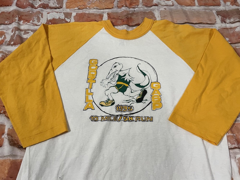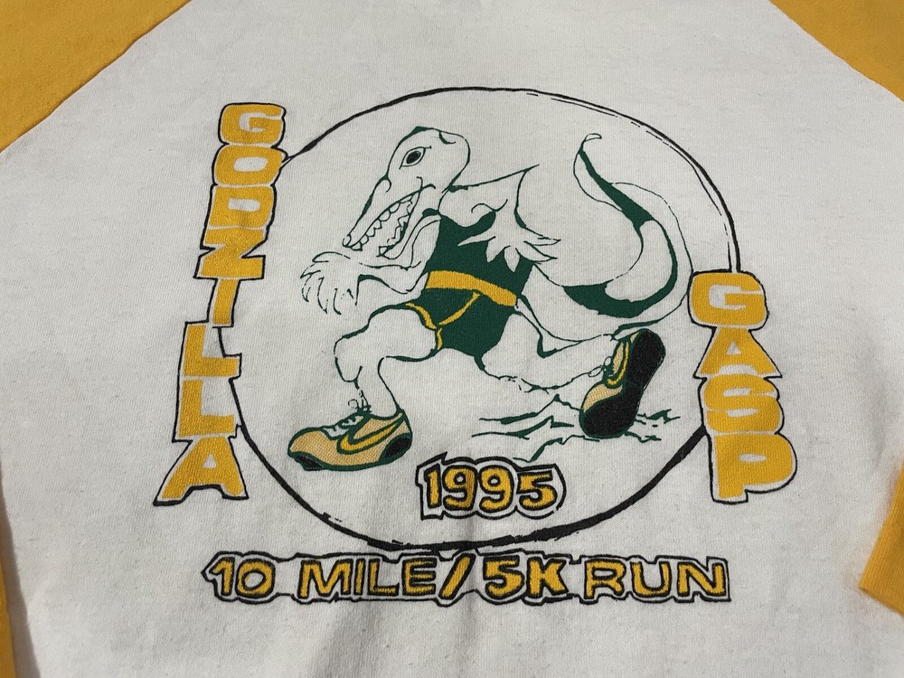 Vintage 1995 Godzilla gasp 10k run Raglan ringer style shirt. Excellent used condition. Very soft. Super unique you'll never find another. Tagged L measures 21" pit to pit and 30" long. Check out the sneakers he's wearing!