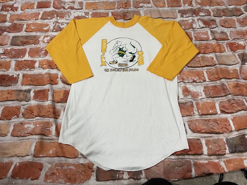 Vintage 1995 Godzilla gasp 10k run Raglan ringer style shirt. Excellent used condition. Very soft. Super unique you'll never find another. Tagged L measures 21" pit to pit and 30" long. Check out the ...