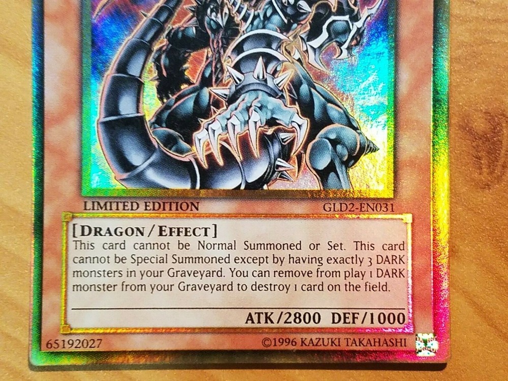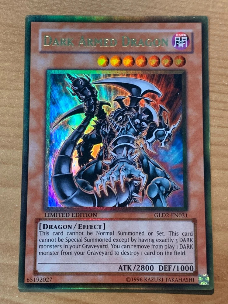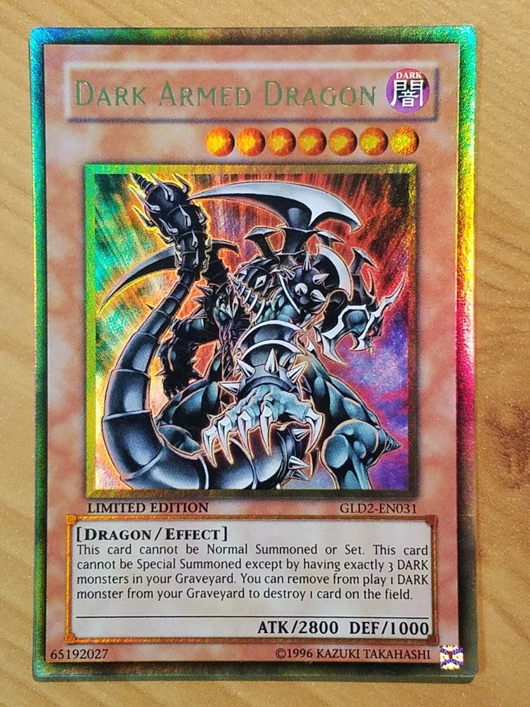 This auction is for (1x) one of the card listed in the title, in the condition listed in the title Dark Armed Dragon GLD2-EN031 Ultra Rare LIMITED EDITION near mint FOR TRADING CARDS: CONDITION INFORMATION v Near Mint (NM) – Card will be Mint or very close to it. v Lightly Played (LP) – Card will have edge wear and/or small dents, but no major creases. v Moderately Played/Played (MP/P) – Card will have visible creases, dents and/or edge wear. v Heavily Played (HP) – Card will noticeable damage such as large creases and/or heavy edge wear. v Damaged (Da) - Card will be in very played condition, heavy edgewear, large creases, entire card may be played. SHIPPING INFORMATION Ø Your items will be shipped out within 24 hours of purchase on BUSINESS DAYS ONLY . This excludes Saturdays, Sundays, and US Holidays. Please allow 2-9 business days for USPS to deliver your items Ø Please add all items to your cart prior to checkout to ensure your items are mailed together. Ø VERY IMPORTANT - PLEASE READ!!! Check your shipping address prior to check out to be sure that we are sending it to the correct address!!! Please be sure to include apartment or unit #’s when applicable. · A PLAYMAT will be shipped in a cardboard tube and tracking information will be included. Multiple playmats will be shipped in a large bubble mailer. · SLEEVES will be shipped in a bubble mailer and tracking information will be included. · CARDS will be placed into a top loader and a sleeve during shipping for protection. Purchases over $15 will have tracking information, free of charge. · FULL DECKS will be sleeved, placed in a deck box, and shipped in a bubble mailer. Tracking will be included. WE SHIP INTERNATIONALLY!!! International Buyers - Please Note: Import duties, taxes, and charges are not included in the item price or shipping cost. These charges are the buyer's responsibility. Please check with your country's customs office to determine what these additional costs will be prior to bidding or buying. · Excludes South America – NO EXCEPTIONS · We will not claim less than the value of what you purchase, so please do not ask. · We ship via the Global Shipping program. Shipping charges are created by eBay and received by their third party shipping department, therefore we do not have any control over the prices. o Includes tracking information (even outside the U.S.). o Insurance for package is also included. FEEL SAFE WHEN SHOPPING WITH US THANK YOU FOR SHOPPING WITH US, PLEASE CHECK OUT OUR OTHER ITEMS FOR MORE GREAT DEALS!