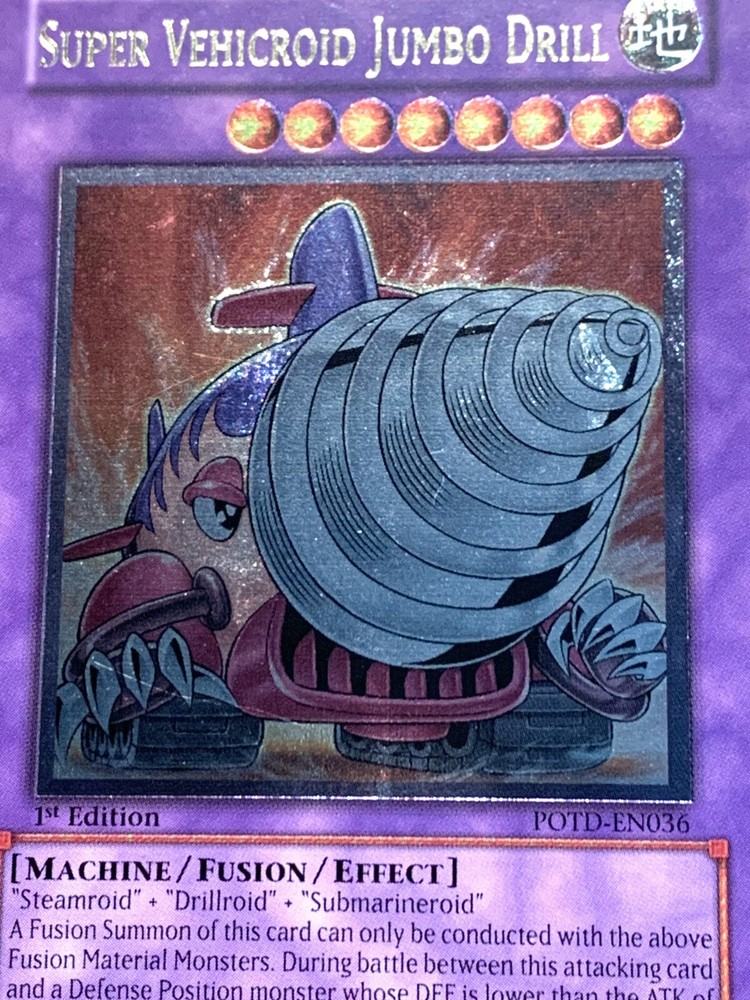 This auction is for (1x) one of the card listed in the title, Super Vehicroid Jumbo Drill POTD-EN036 1st Edition Ultimate Rare Near Mint in the condition listed in the title FOR TRADING CARDS: CONDITION INFORMATION v Near Mint (NM) – Card will be Mint or very close to it. v Lightly Played (LP) – Card will have edge wear and/or small dents, but no major creases. v Moderately Played/Played (MP/P) – Card will have visible creases, dents and/or edge wear. v Heavily Played (HP) – Card will noticeable damage such as large creases and/or heavy edge wear. v Damaged (Da) - Card will be in very played condition, heavy edgewear, large creases, entire card may be played. SHIPPING INFORMATION Ø Your items will be shipped out within 24 hours of purchase on BUSINESS DAYS ONLY . This excludes Saturdays, Sundays, and US Holidays. Please allow 2-9 business days for USPS to deliver your items Ø Please add all items to your cart prior to checkout to ensure your items are mailed together. Ø VERY IMPORTANT - PLEASE READ!!! Check your shipping address prior to check out to be sure that we are sending it to the correct address!!! Please be sure to include apartment or unit #’s when applicable. · A PLAYMAT will be shipped in a cardboard tube and tracking information will be included. Multiple playmats will be shipped in a large bubble mailer. · SLEEVES will be shipped in a bubble mailer and tracking information will be included. · CARDS will be placed into a top loader and a sleeve during shipping for protection. Purchases over $15 will have tracking information, free of charge. · FULL DECKS will be sleeved, placed in a deck box, and shipped in a bubble mailer. Tracking will be included. WE SHIP INTERNATIONALLY!!! International Buyers - Please Note: Import duties, taxes, and charges are not included in the item price or shipping cost. These charges are the buyer's responsibility. Please check with your country's customs office to determine what these additional costs will be prior to bidding or buying. · Excludes South America – NO EXCEPTIONS · We will not claim less than the value of what you purchase, so please do not ask. · We ship via the Global Shipping program. Shipping charges are created by eBay and received by their third party shipping department, therefore we do not have any control over the prices. o Includes tracking information (even outside the U.S.). o Insurance for package is also included. FEEL SAFE WHEN SHOPPING WITH US THANK YOU FOR SHOPPING WITH US, PLEASE CHECK OUT OUR OTHER ITEMS FOR MORE GREAT DEALS!